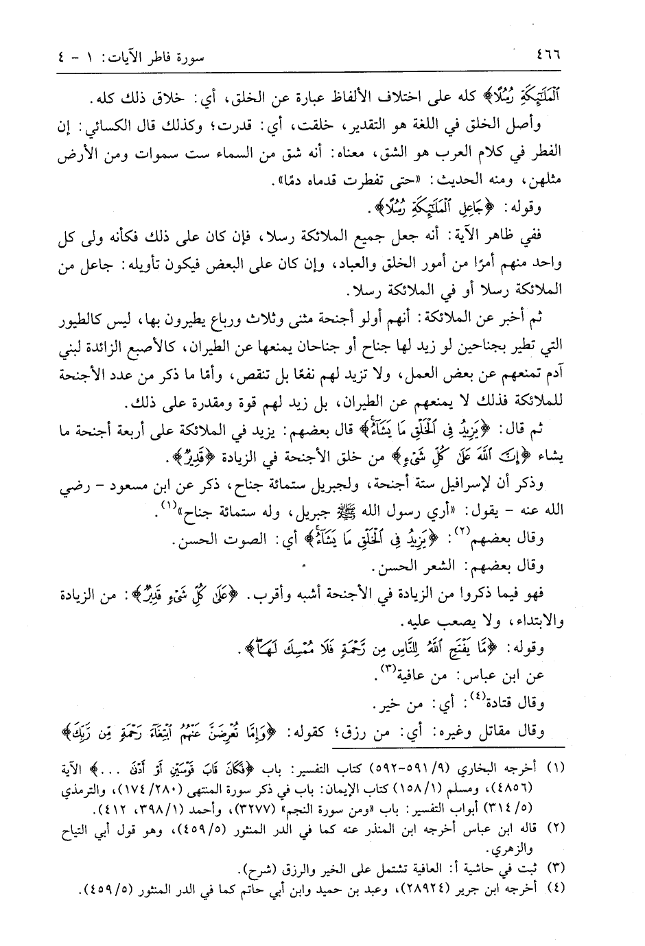 ثم أخبر عن الملائكة: أنهم أولو أجنحة مثنى وثلاث ورباع يطيرون بها، ليس كالطيور التي تطير بجناحين لو زيد لها جناح أو جناحان يمنعها عن الطيران، كالأصبع الزائدة لبني آدم تمنعهم عن بعض العمل، ولا تزيد لهم نفعًا بل تنقص، وأمَّا ما ذكر من عدد الأجنحة للملائكة فذلك لا يمنعهم عن الطيران، بل زيد لهم قوة ومقدرة على ذلك.