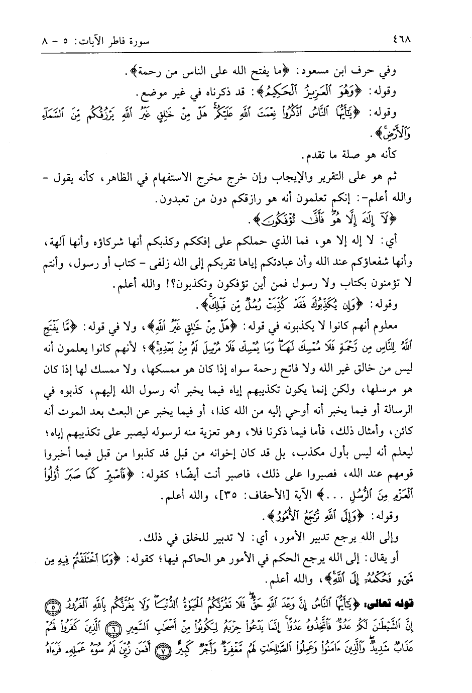 وقوله: (يَا أَيُّهَا النَّاسُ اذْكُرُوا نِعْمَتَ اللَّهِ عَلَيْكُمْ هَلْ مِنْ خَالِقٍ غَيْرُ اللَّهِ يَرْزُقُكُمْ مِنَ السَّمَاءِ وَالْأَرْضِ لَا إِلَهَ إِلَّا هُوَ فَأَنَّى تُؤْفَكُونَ (3)