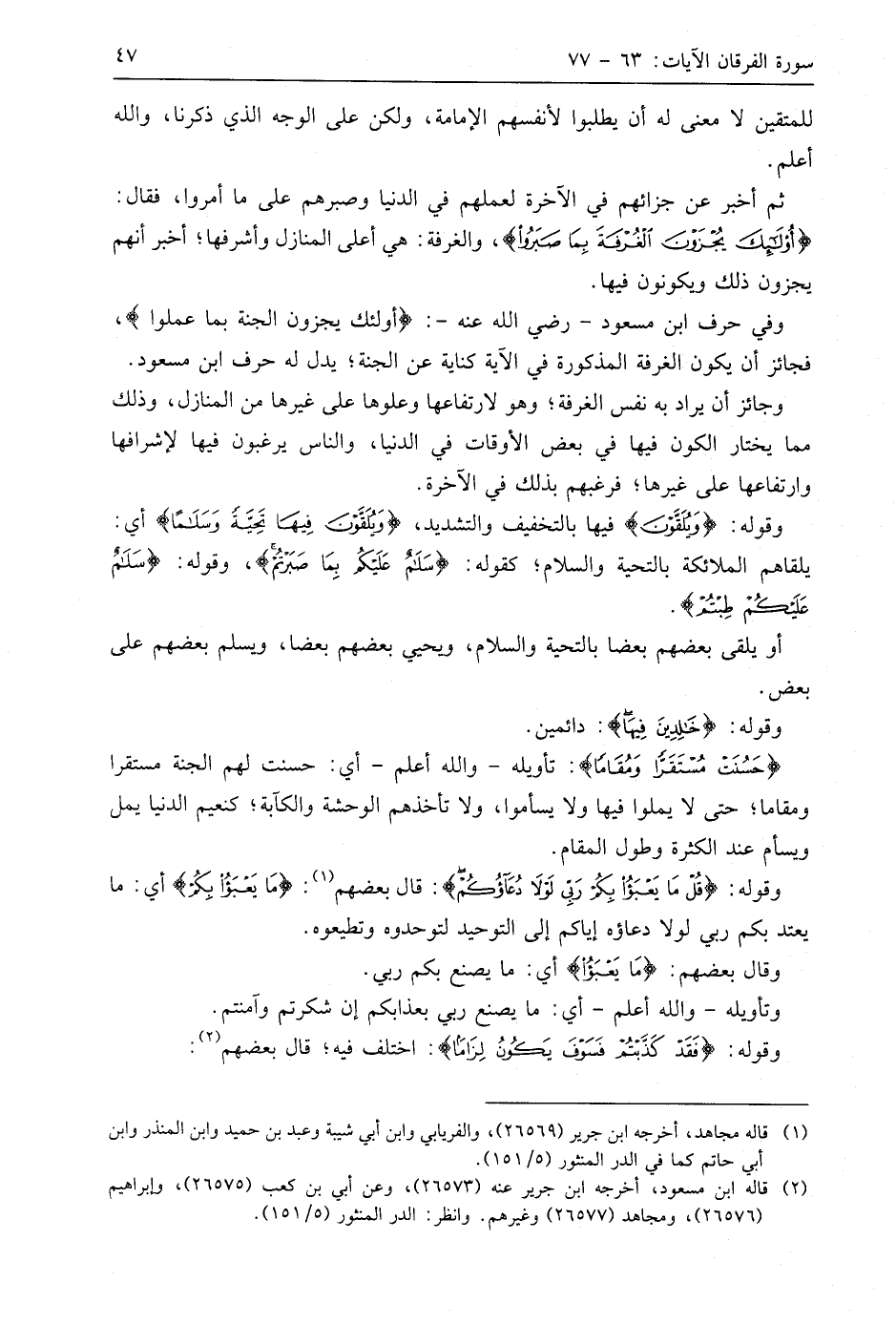 وفي حرف ابن مسعود - رَضِيَ اللَّهُ عَنْهُ -: (أُولَئِكَ يُجْزَوْنَ الْغُرْفَةَ بِمَا صَبَرُوا)، فجائز أن يكون الغرفة المذكورة في الآية كناية عن الجنة؛ يدل له حرف ابن مسعود.