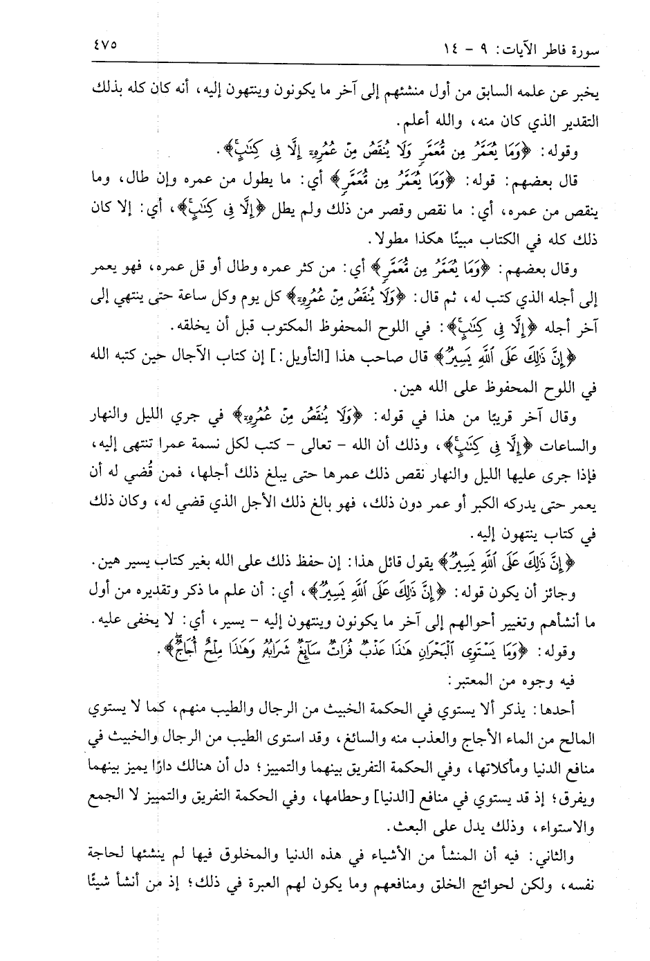 وقَالَ بَعْضُهُمْ: (وَمَا يُعَمَّرُ مِنْ مُعَمَّرٍ) أي: من كثر عمره وطال أو قل عمره، فهو يعمر إلى أجله الذي كمّب له، ثم قال: (وَلَا يُنْقَصُ مِنْ عُمُرِهِ) كل يوم وكل ساعة حتى ينتهي إلى آخر أجله (إِلَّا فِي كِتَابٍ): في اللوح المحفوظ المكتوب قبل أن يخلقه.