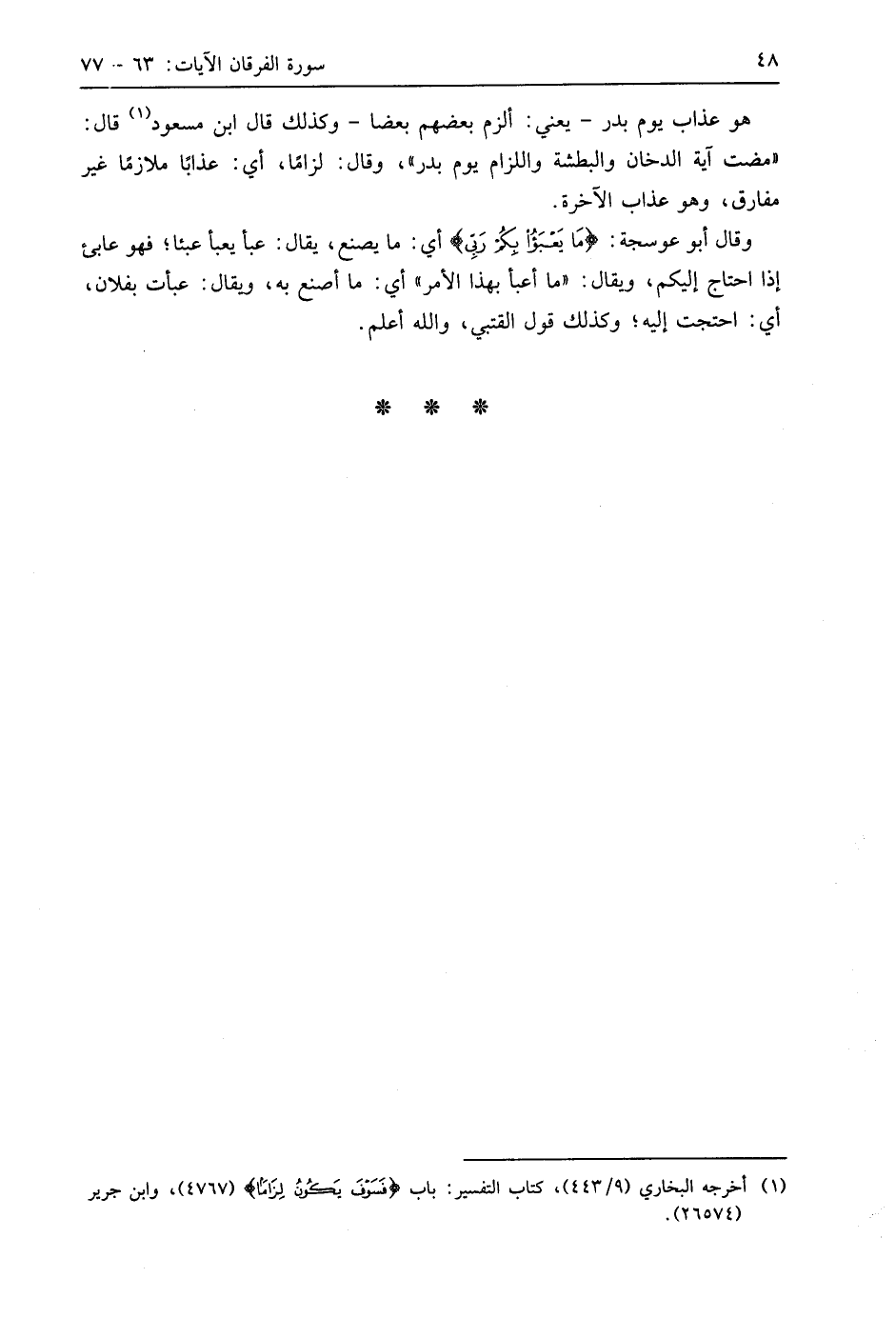 وقال أَبُو عَوْسَجَةَ: (مَا يَعْبَأُ بِكُمْ رَبِّي) أي: ما يصنع، يقال: عبأ يعبأ عبئا؛ فهو عابئ إذا احتاج إليكم، ويقال: " ما أعبأ بهذا الأمر " أي: ما أصنع به، ويقال: عبأت بفلان، أي: احتجت إليه؛ وكذلك قول الْقُتَبِيّ، واللَّه أعلم.