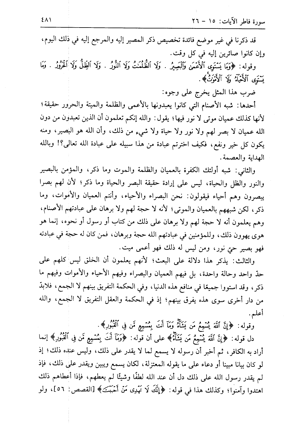 وقوله: (وَمَا يَسْتَوِي الْأَعْمَى وَالْبَصِيرُ (19) وَلَا الظُّلُمَاتُ وَلَا النُّورُ (20) وَلَا الظِّلُّ وَلَا الْحَرُورُ (21) وَمَا يَسْتَوِي الْأَحْيَاءُ وَلَا الْأَمْوَاتُ ... (22)
