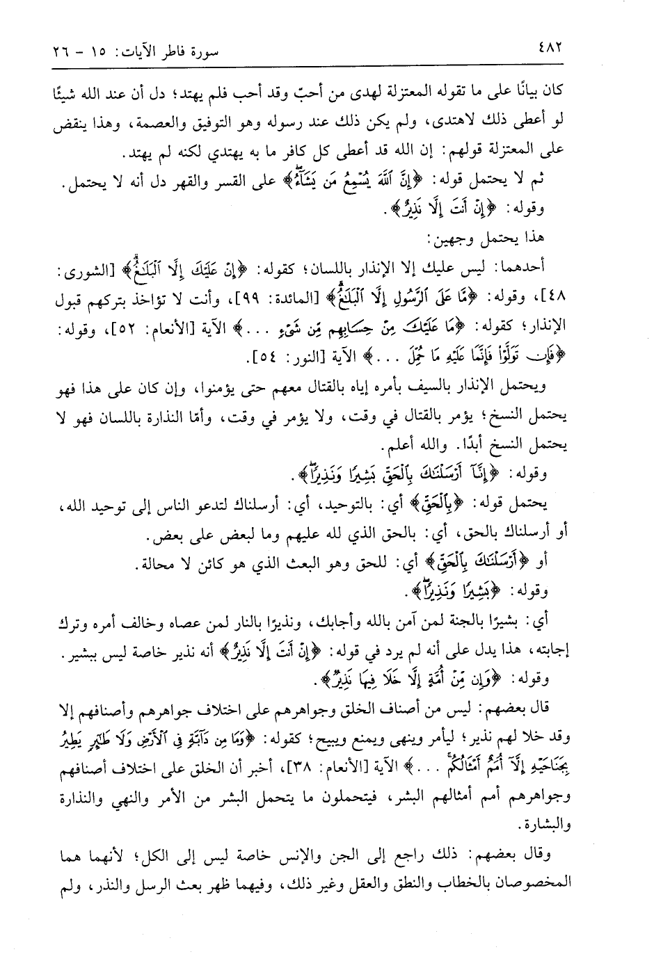 وقوله: (إِنَّا أَرْسَلْنَاكَ بِالْحَقِّ بَشِيرًا وَنَذِيرًا وَإِنْ مِنْ أُمَّةٍ إِلَّا خَلَا فِيهَا نَذِيرٌ (24) يحتمل قوله: (بِالْحَقِّ) أي: بالتوحيد، أي: أرسلناك لتدعو الناس إلى توحيد اللَّه، أو أرسلناك بالحق، أي: بالحق الذي لله عليهم وما لبعض على بعض.