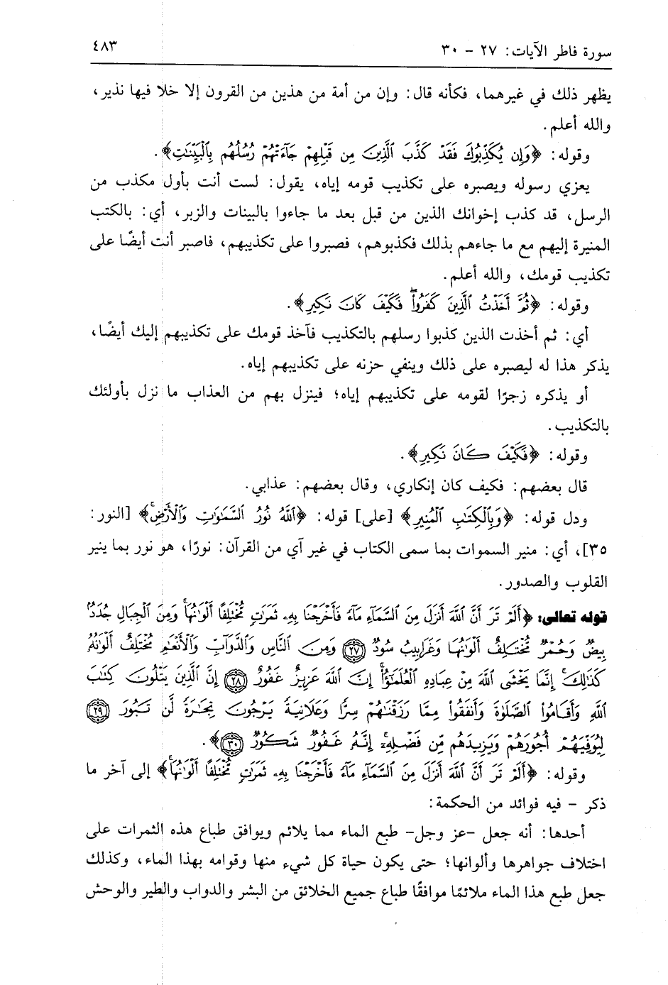 قوله تعالى: (أَلَمْ تَرَ أَنَّ اللَّهَ أَنْزَلَ مِنَ السَّمَاءِ مَاءً فَأَخْرَجْنَا بِهِ ثَمَرَاتٍ مُخْتَلِفًا أَلْوَانُهَا وَمِنَ الْجِبَالِ جُدَدٌ بِيضٌ وَحُمْرٌ مُخْتَلِفٌ أَلْوَانُهَا وَغَرَابِيبُ سُودٌ (27) وَمِنَ النَّاسِ وَالدَّوَابِّ وَالْأَنْعَامِ مُخْتَلِفٌ أَلْوَانُهُ كَذَلِكَ إِنَّمَا يَخْشَى اللَّهَ مِنْ عِبَادِهِ الْعُلَمَاءُ إِنَّ اللَّهَ عَزِيزٌ غَفُورٌ (28) إِنَّ الَّذِينَ يَتْلُونَ كِتَابَ اللَّهِ وَأَقَامُوا الصَّلَاةَ وَأَنْفَقُوا مِمَّا رَزَقْنَاهُمْ سِرًّا وَعَلَانِيَةً يَرْجُونَ تِجَارَةً لَنْ تَبُورَ (29) لِيُوَفِّيَهُمْ أُجُورَهُمْ وَيَزِيدَهُمْ مِنْ فَضْلِهِ إِنَّهُ غَفُورٌ شَكُورٌ (30)