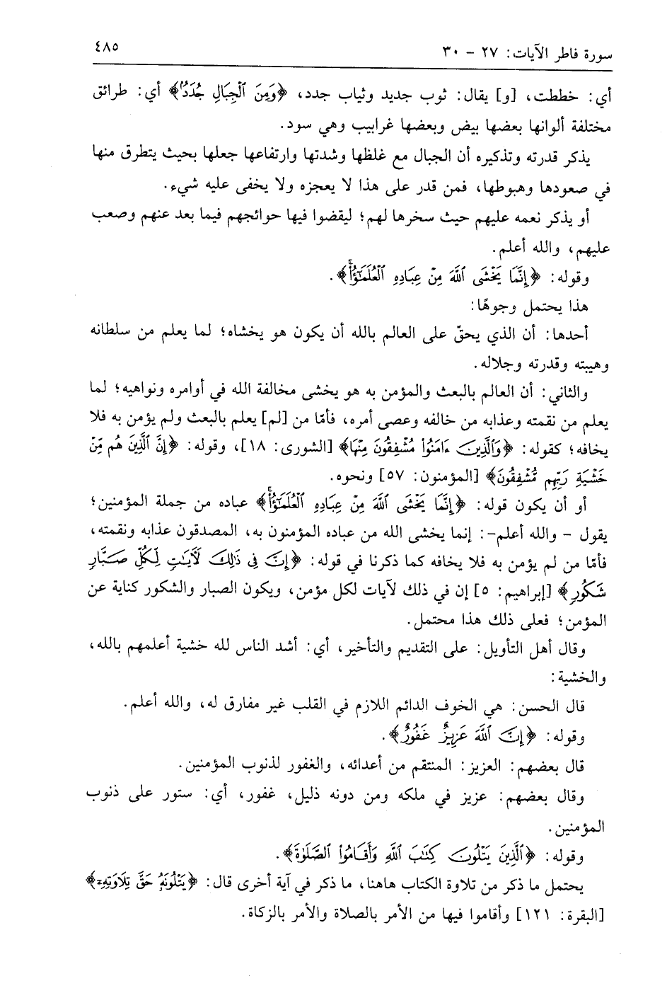 أو أن يكون قوله: (إِنَّمَا يَخْشَى اللَّهَ مِنْ عِبَادِهِ الْعُلَمَاءُ) عباده من جملة المؤمنين؛ يقول - واللَّه أعلم -: إنما يخشى اللَّه من عباده المؤمنون به، المصدقون عذابه ونقمته، فأمَّا من لم يؤمم ن به فلا يخافه كما ذكرنا في قوله: (إِنَّ فِي ذَلِكَ لَآيَاتٍ لِكُلِّ صَبَّارٍ شَكُورٍ)، إن في ذلك لآيات لكل مؤمن، ويكون الصبار والشكور كناية عن المؤمن؛ فعلى ذلك هذا محتمل.