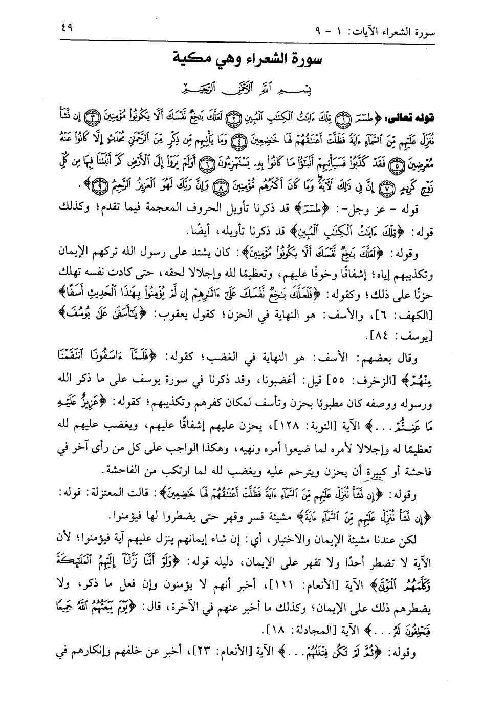 قوله تعالى: (طسم (1) تِلْكَ آيَاتُ الْكِتَابِ الْمُبِينِ (2) لَعَلَّكَ بَاخِعٌ نَفْسَكَ أَلَّا يَكُونُوا مُؤْمِنِينَ (3) إِنْ نَشَأْ نُنَزِّلْ عَلَيْهِمْ مِنَ السَّمَاءِ آيَةً فَظَلَّتْ أَعْنَاقُهُمْ لَهَا خَاضِعِينَ (4) وَمَا يَأْتِيهِمْ مِنْ ذِكْرٍ مِنَ الرَّحْمَنِ مُحْدَثٍ إِلَّا كَانُوا عَنْهُ مُعْرِضِينَ (5) فَقَدْ كَذَّبُوا فَسَيَأْتِيهِمْ أَنْبَاءُ مَا كَانُوا بِهِ يَسْتَهْزِءُونَ (6) أَوَلَمْ يَرَوْا إِلَى الْأَرْضِ كَمْ أَنْبَتْنَا فِيهَا مِنْ كُلِّ زَوْجٍ كَرِيمٍ (7) إِنَّ فِي ذَلِكَ لَآيَةً وَمَا كَانَ أَكْثَرُهُمْ مُؤْمِنِينَ (8) وَإِنَّ رَبَّكَ لَهُوَ الْعَزِيزُ الرَّحِيمُ (9)