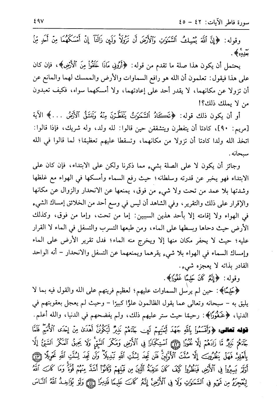 وقوله: (إِنَّ اللَّهَ يُمْسِكُ السَّمَاوَاتِ وَالْأَرْضَ أَنْ تَزُولَا وَلَئِنْ زَالَتَا إِنْ أَمْسَكَهُمَا مِنْ أَحَدٍ مِنْ بَعْدِهِ إِنَّهُ كَانَ حَلِيمًا غَفُورًا (41)