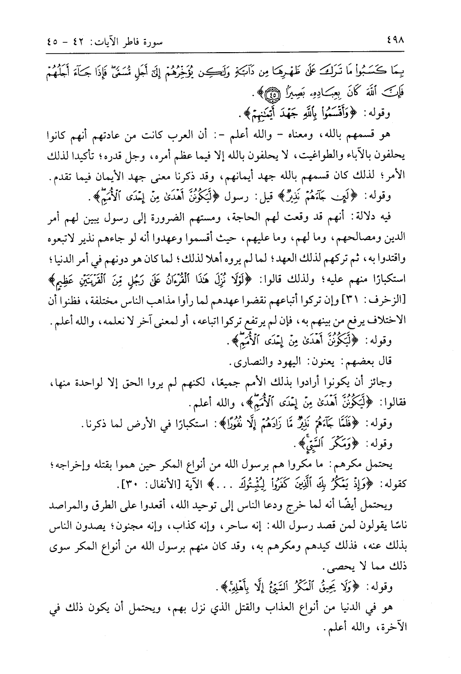 وقوله: (وَأَقْسَمُوا بِاللَّهِ جَهْدَ أَيْمَانِهِمْ لَئِنْ جَاءَهُمْ نَذِيرٌ لَيَكُونُنَّ أَهْدَى مِنْ إِحْدَى الْأُمَمِ فَلَمَّا جَاءَهُمْ نَذِيرٌ مَا زَادَهُمْ إِلَّا نُفُورًا (42)