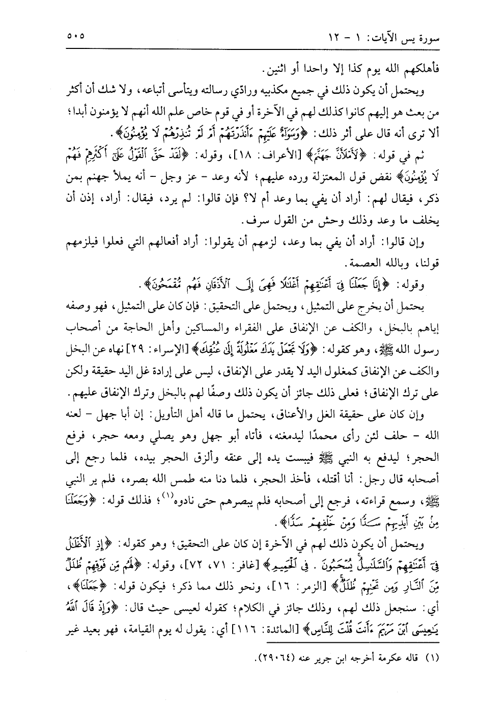 وإن كان على حقيقة الغل والأعناق، يحتمل ما قاله أهل التأويل: إن أبا جهل - لعنه اللَّه - حلف لئن رأى محمدًا ليدمغنه، فأتاه أبو جهل وهو يصلي ومعه حجر، فرفع الحجر؛ ليدفع له النبي - صَلَّى اللَّهُ عَلَيهِ وَسَلَّمَ - فيبست يده إلى عنقه وألزق الحجر بيده، فلما رجع إلى أصحابه قال رجل: أنا أقتله، فأخذ الحجر، فلما دنا منه طمس اللَّه بصره، فلم ير النبي - صَلَّى اللَّهُ عَلَيهِ وَسَلَّمَ -، وسمع قراءته، فرجع إلى أصحابه فلم يبصرهم حتى نادوه؛ فذلك قوله: (وَجَعَلْنَا مِنْ بَيْنِ أَيْدِيهِمْ سَدًّا وَمِنْ خَلْفِهِمْ سَدًّا ... (9)