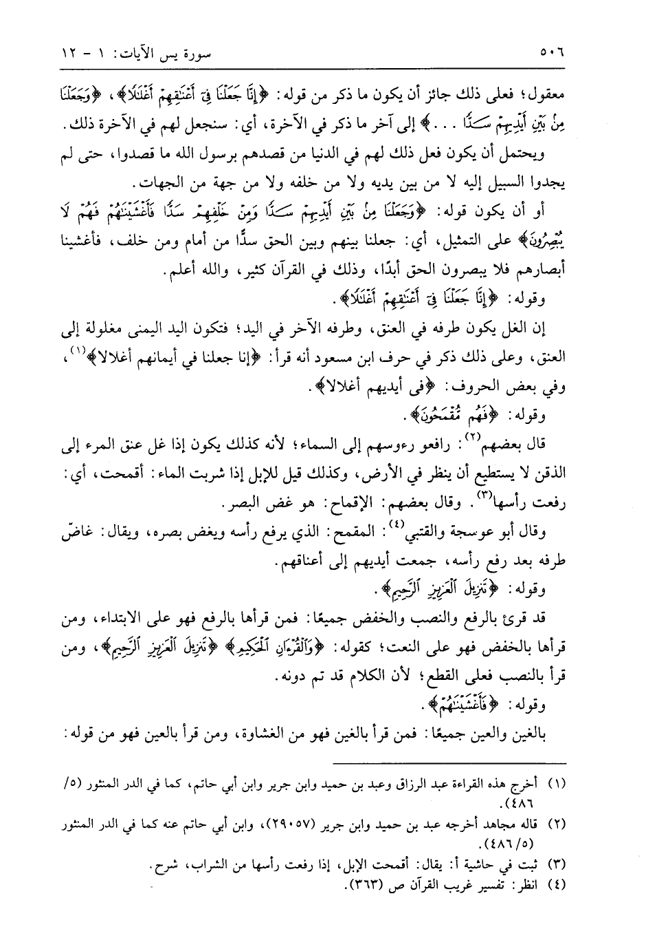 معقول؛ فعلى ذلك جائز أن يكون ما ذكر من قوله: (إِنَّا جَعَلْنَا فِي أَعْنَاقِهِمْ أَغْلَالًا)، (وَجَعَلْنَا مِنْ بَيْنِ أَيْدِيهِمْ سَدًّا. . .) إلى آخر ما ذكر في الآخرة، أي: سنجعل لهم في الآخرة ذلك.