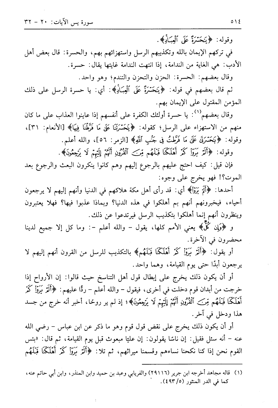 ثم قَالَ بَعْضُهُمْ في قوله: (يَا حَسْرَةً عَلَى الْعِبَادِ): أي: يا حسرة الرسل على ذلك المؤمن المقتول على الإيمان بهم.
