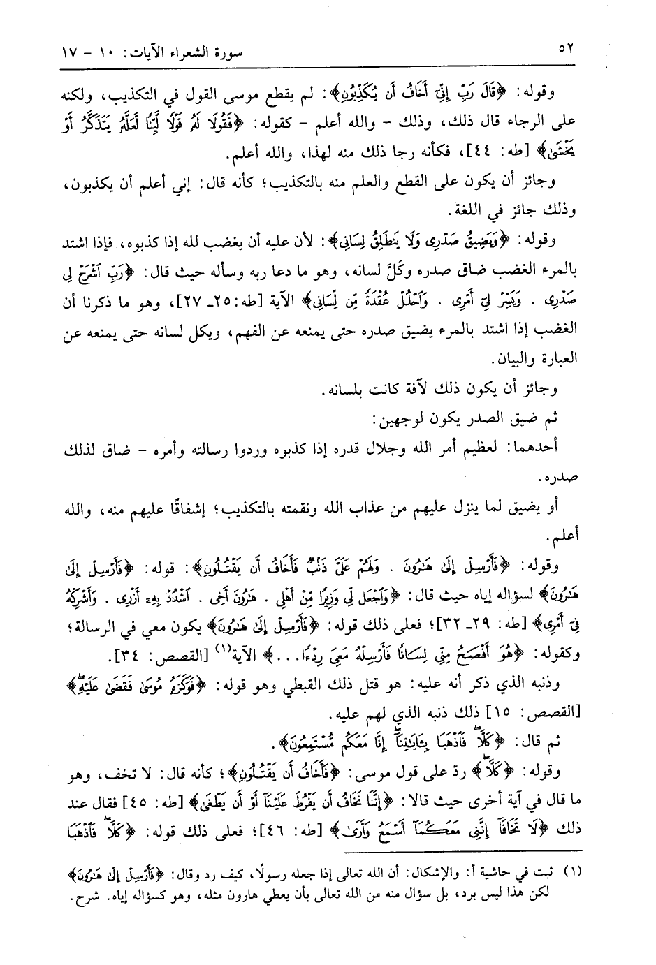 وقوله: (وَيَضِيقُ صَدْرِي وَلَا يَنْطَلِقُ لِسَانِي فَأَرْسِلْ إِلَى هَارُونَ (13) لأن عليه أن يغضب لله إذا كذبوه، فإذا اشتد بالمرء الغضب ضاق صدره وكَلَّ لسانه، وهو ما دعا ربه وساله حيث قال: (رَبِّ اشْرَحْ لِي صَدْرِي (25) وَيَسِّرْ لِي أَمْرِي (26) وَاحْلُلْ عُقْدَةً مِنْ لِسَانِي) الآية، وهو ما ذكرنا أن الغضب إذا اشتد بالمرء يضيق صدره حتى يمنعه عن الفهم، ويكل لسانه حتى يمنعه عن العبارة والبيان.