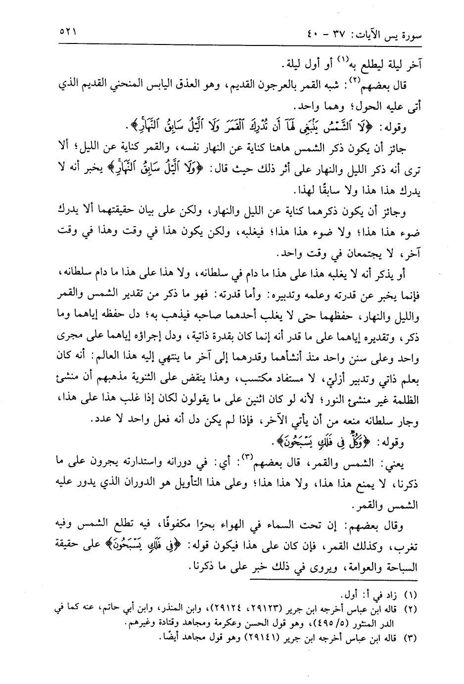 جائز أن يكون ذكر الشمس هاهنا كناية عن النهار نفسه، والقمر كناية عن الليل؛ ألا ترى أنه ذكر الليل والنهار على أثر ذلك حيث قال: (وَلَا اللَّيْلُ سَابِقُ النَّهَارِ) يخبر أنه لا يدرك هذا هذا ولا سابقًا لهذا.