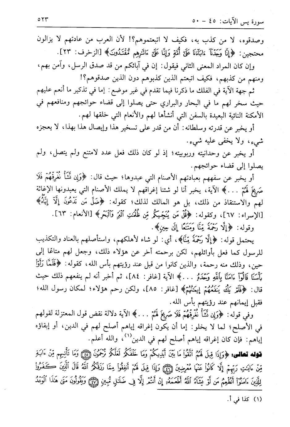 أو يخبر عن سفههم بعبادتهم الأصنام التي عبدوها؛ حيث قال: (وَإِنْ نَشَأْ نُغْرِقْهُمْ فَلَا صَرِيخَ لَهُمْ ... (43) يخبر أنا لو شئنا إغراقهم لا يملك الأصنام التي يعبدونها الإغاثة لهم والاستنقاذ من ذلك، بل هو المالك لذلك؛ كقوله: (ضَلَّ مَنْ تَدْعُونَ إِلَّا إِيَّاهُ)، وكقوله: (قُلْ مَنْ يُنَجِّيكُمْ مِنْ ظُلُمَاتِ الْبَرِّ وَالْبَحْرِ).