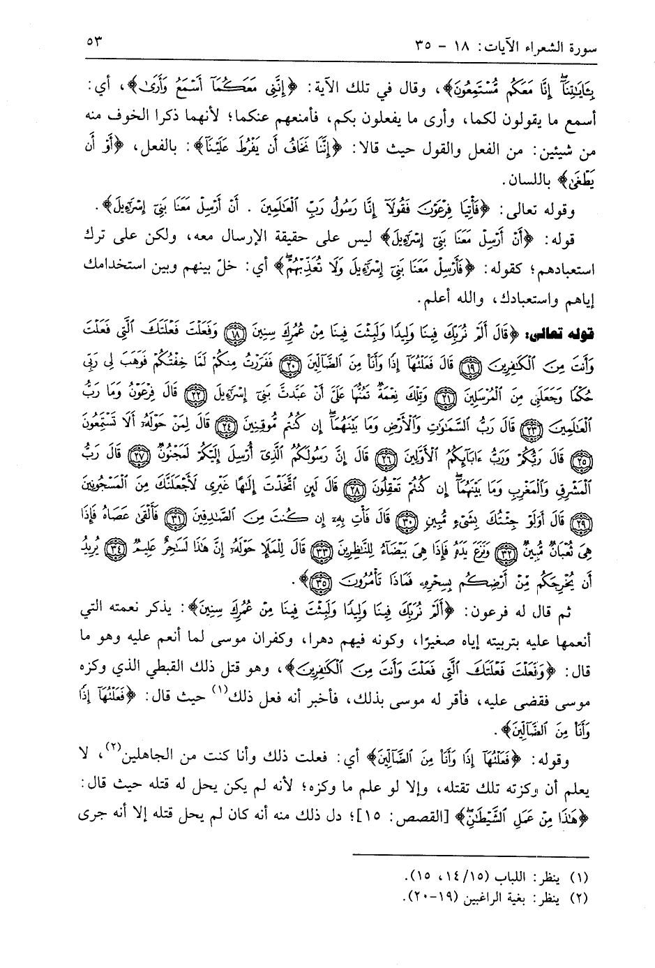 قوله تعالى: (قَالَ أَلَمْ نُرَبِّكَ فِينَا وَلِيدًا وَلَبِثْتَ فِينَا مِنْ عُمُرِكَ سِنِينَ (18) وَفَعَلْتَ فَعْلَتَكَ الَّتِي فَعَلْتَ وَأَنْتَ مِنَ الْكَافِرِينَ (19) قَالَ فَعَلْتُهَا إِذًا وَأَنَا مِنَ الضَّالِّينَ (20) فَفَرَرْتُ مِنْكُمْ لَمَّا خِفْتُكُمْ فَوَهَبَ لِي رَبِّي حُكْمًا وَجَعَلَنِي مِنَ الْمُرْسَلِينَ (21) وَتِلْكَ نِعْمَةٌ تَمُنُّهَا عَلَيَّ أَنْ عَبَّدْتَ بَنِي إِسْرَائِيلَ (22) قَالَ فِرْعَوْنُ وَمَا رَبُّ الْعَالَمِينَ (23) قَالَ رَبُّ السَّمَاوَاتِ وَالْأَرْضِ وَمَا بَيْنَهُمَا إِنْ كُنْتُمْ مُوقِنِينَ (24) قَالَ لِمَنْ حَوْلَهُ أَلَا تَسْتَمِعُونَ (25) قَالَ رَبُّكُمْ وَرَبُّ آبَائِكُمُ الْأَوَّلِينَ (26) قَالَ إِنَّ رَسُولَكُمُ الَّذِي أُرْسِلَ إِلَيْكُمْ لَمَجْنُونٌ (27) قَالَ رَبُّ الْمَشْرِقِ وَالْمَغْرِبِ وَمَا بَيْنَهُمَا إِنْ كُنْتُمْ تَعْقِلُونَ (28) قَالَ لَئِنِ اتَّخَذْتَ إِلَهًا غَيْرِي لَأَجْعَلَنَّكَ مِنَ الْمَسْجُونِينَ (29) قَالَ أَوَلَوْ جِئْتُكَ بِشَيْءٍ مُبِينٍ (30) قَالَ فَأْتِ بِهِ إِنْ كُنْتَ مِنَ الصَّادِقِينَ (31) فَأَلْقَى عَصَاهُ فَإِذَا هِيَ ثُعْبَانٌ مُبِينٌ (32) وَنَزَعَ يَدَهُ فَإِذَا هِيَ بَيْضَاءُ لِلنَّاظِرِينَ (33) قَالَ لِلْمَلَإِ حَوْلَهُ إِنَّ هَذَا لَسَاحِرٌ عَلِيمٌ (34) يُرِيدُ أَنْ يُخْرِجَكُمْ مِنْ أَرْضِكُمْ بِسِحْرِهِ فَمَاذَا تَأْمُرُونَ (35)