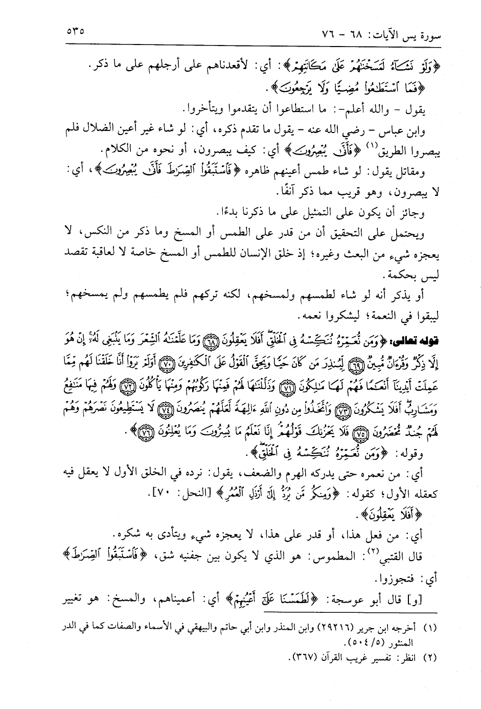 وقوله: (وَمَنْ نُعَمِّرْهُ نُنَكِّسْهُ فِي الْخَلْقِ).
