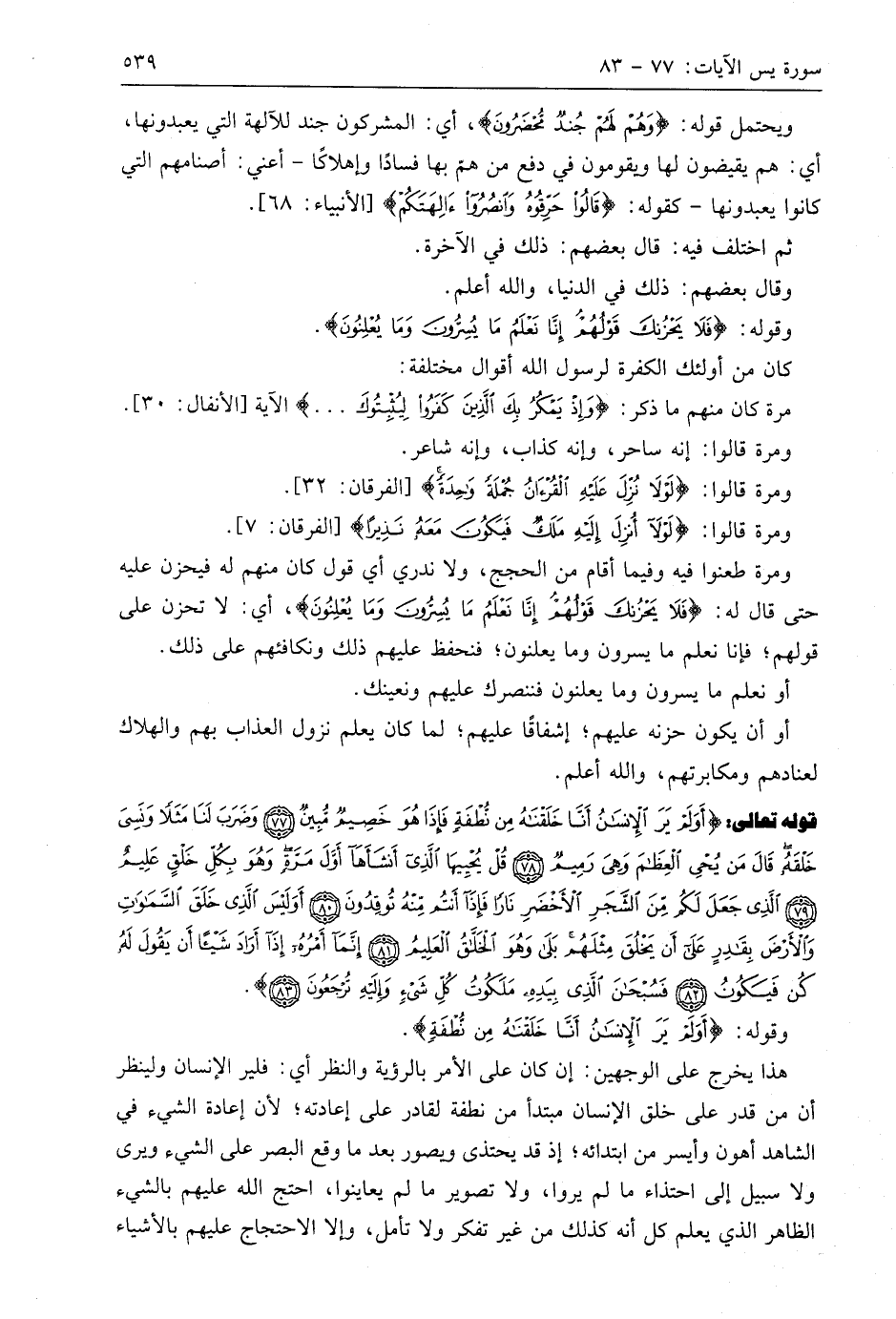 قوله تعالى: (أَوَلَمْ يَرَ الْإِنْسَانُ أَنَّا خَلَقْنَاهُ مِنْ نُطْفَةٍ فَإِذَا هُوَ خَصِيمٌ مُبِينٌ (77) وَضَرَبَ لَنَا مَثَلًا وَنَسِيَ خَلْقَهُ قَالَ مَنْ يُحْيِ الْعِظَامَ وَهِيَ رَمِيمٌ (78) قُلْ يُحْيِيهَا الَّذِي أَنْشَأَهَا أَوَّلَ مَرَّةٍ وَهُوَ بِكُلِّ خَلْقٍ عَلِيمٌ (79) الَّذِي جَعَلَ لَكُمْ مِنَ الشَّجَرِ الْأَخْضَرِ نَارًا فَإِذَا أَنْتُمْ مِنْهُ تُوقِدُونَ (80) أَوَلَيْسَ الَّذِي خَلَقَ السَّمَاوَاتِ وَالْأَرْضَ بِقَادِرٍ عَلَى أَنْ يَخْلُقَ مِثْلَهُمْ بَلَى وَهُوَ الْخَلَّاقُ الْعَلِيمُ (81) إِنَّمَا أَمْرُهُ إِذَا أَرَادَ شَيْئًا أَنْ يَقُولَ لَهُ كُنْ فَيَكُونُ (82) فَسُبْحَانَ الَّذِي بِيَدِهِ مَلَكُوتُ كُلِّ شَيْءٍ وَإِلَيْهِ تُرْجَعُونَ (83)
