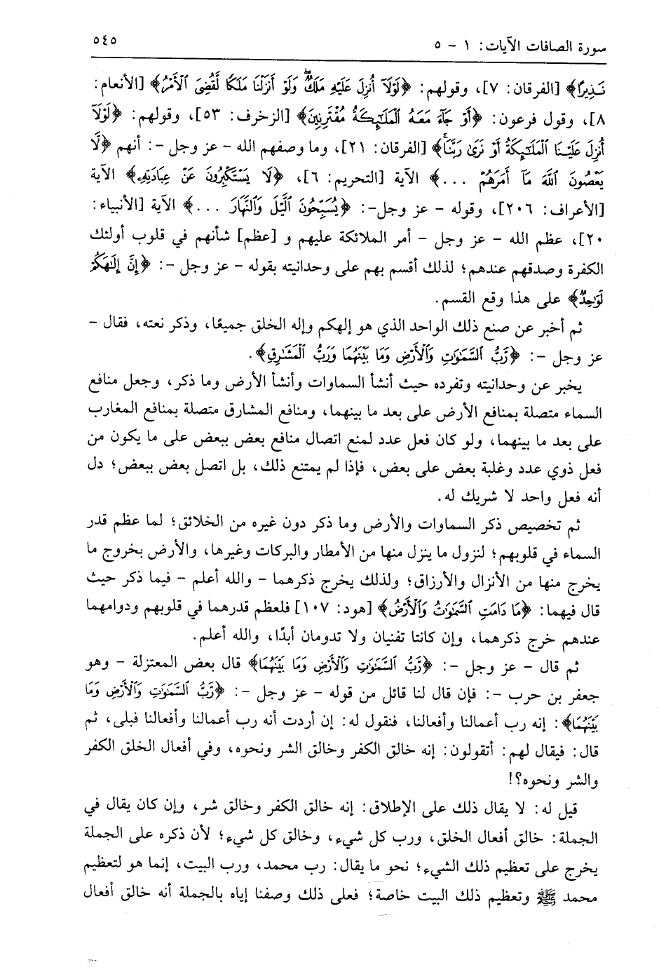 ثم قال - عَزَّ وَجَلَّ -: (رَبُّ السَّمَاوَاتِ وَالْأَرْضِ وَمَا بَيْنَهُمَا) قال بعض المعتزلة - وهو جعفر بن حرب -: فإن قال لنا قائل من قوله - عَزَّ وَجَلَّ -: (رَبُّ السَّمَاوَاتِ وَالْأَرْضِ وَمَا بَيْنَهُمَا): إنه رب أعمالنا وأفعالنا، فنقول له: إن أردت أنه رب أعمالنا وأفعالنا فبلى، ثم قال: فيقال لهم: أتقولون: إنه خالق الكفر وخالق الشر ونحوه، وفي أفعال الخلق الكفر والشر ونحوه؟!