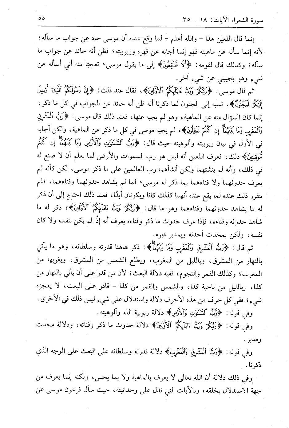 ثم قال: (رَبُّ الْمَشْرِقِ وَالْمَغْرِبِ وَمَا بَيْنَهُمَا): ذكر هاهنا قدرته وسلطانه، وهو ما يأتي بالنهار من المشرق، وبالليل من المغرب، ويطلع الشمس من المشرق، ويغربها من المغرب؛ وكذلك القمر والنجوم، ففيه دلالة البعث؛ لأن من قدر على أن يأتي بالنهار من كذا، وبالليل من ناحية كذا، والشَّمس والقمر من كذا - قادر على البعث، لا يعجزه شيء؛ ففي كل حرف من هذه الأحرف دلالة واستدلال على شيء ليس ذلك في الأخرى.