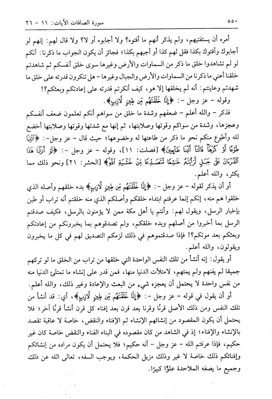 أو أن يقول في قوله - عَزَّ وَجَلَّ -: (إِنَّا خَلَقْنَاهُمْ مِنْ طِينٍ لَازِبٍ)، أي: قد أنشأ من تلك النفس ومن ذلك الأصل قرنا وقرنا بعد قرن بعد إفناء كل قرن أنشأ قرنًا آخر؛ فلا يحتمل أن يكون المقصود من إنشائهم الإنشاء ثم الإفناء والنقض، خاصة لا عاقبة تقصد بالإنشاء والإفناء؛ إذ في الشاهد من كان مقصوده في البناء الفناء والنقض خاصة كان غير حكيم، فإذا عرفتم اللَّه - عَزَّ وَجَلَّ - أنه حكيم؛ فلا يحتمل أن يكون مراده من إنشائكم وإفنائكم ذلك خاصة لا غير وذلك مزيل الحكمة، ويوجب السفه، تعالى اللَّه عن ذلك وجميع ما يصفه الملاحدة علوًّا كبيرًا.