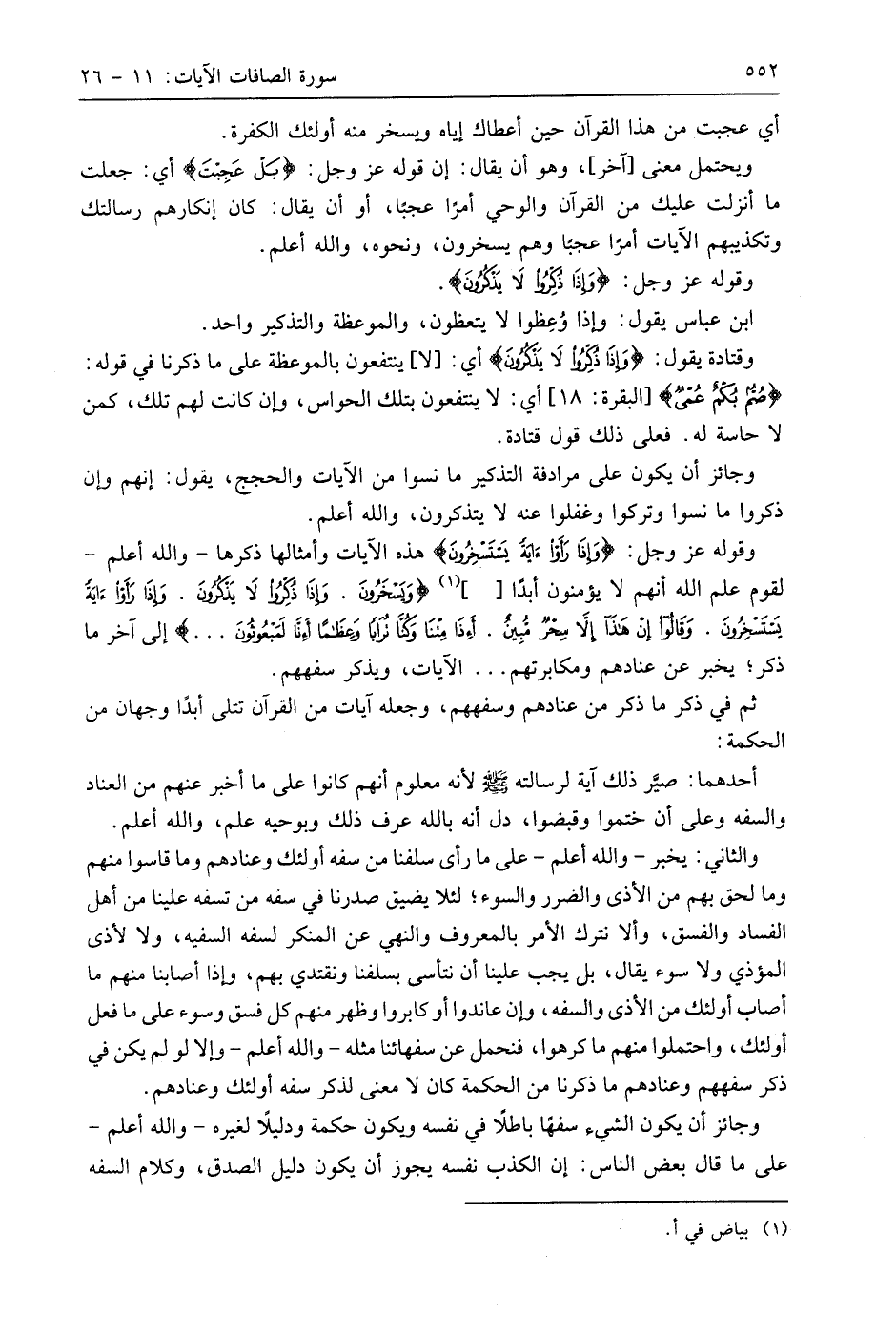 وقوله عَزَّ وَجَلَّ: (وَإِذَا رَأَوْا آيَةً يَسْتَسْخِرُونَ (14) هذه الآيات وأمثالها ذكرها - واللَّه أعلم - لقوم علم اللَّه أنهم لا يؤمنون أبدًا، (لَا يَذْكُرُونَ (13) وَإِذَا رَأَوْا آيَةً يَسْتَسْخِرُونَ (14) وَقَالُوا إِنْ هَذَا إِلَّا سِحْرٌ مُبِينٌ (15) أَإِذَا مِتْنَا وَكُنَّا تُرَابًا وَعِظَامًا أَإِنَّا لَمَبْعُوثُونَ. . .) إلى آخر ما ذكر؛ يخبر عن عنادهم ومكابرتهم. . . الآيات، ويذكر سفههم.