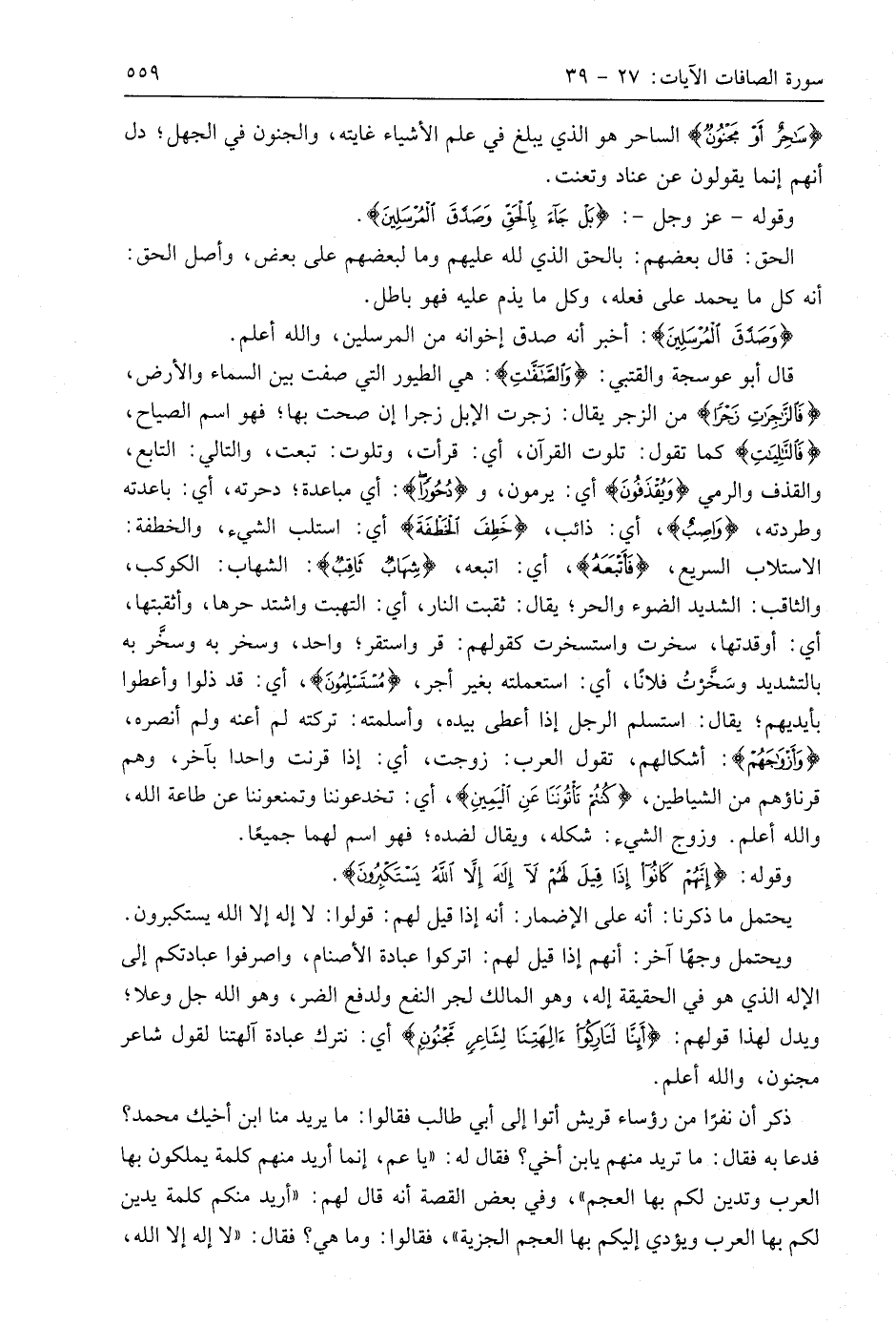 قال أَبُو عَوْسَجَةَ والْقُتَبِيّ: (وَالصَّافَّاتِ): هي الطيور التي صفت بين السماء والأرض، (فَالزَّاجِرَاتِ زَجْرًا) من الزجر يقال: زجرت الإبل زجرا إن صحت بها؛ فهو اسم الصياح، (فَالتَّالِيَاتِ) كما تقول: تلوت القرآن، أي: قرأت، وتلوت: تبعت، والتالي: التابع، والقذف والرمي (وَيُقْذَفُونَ) أي: يرمون، و (دُحُورًا): أي مباعدة؛ دحرته، أي: باعدته وطردته، (وَاصِبٌ)، أي: [دائب]، (خَطِفَ الْخَطْفَةَ) أي: استلب الشيء، والخطفة: الاستلاب السريع، (فَأَتْبَعَهُ)، أي: اتبعه، (شِهَابٌ ثَاقِبٌ): الشهاب: الكوكب، والثاقب: الشديد الضوء والحر؛ يقال: ثقبت النار، أي: التهبت واشتد حرها، وأثقبتها، أي: أوقدتها، سخرت واستسخرت كقولهم: قر واستقر؛ واحد، وسخر به وسخر به بالتشديد وسَخَّرتُ فلانا، أي: استعملته بغير أجر، (مُسْتَسْلِمُونَ)، أي: قد ذلوا وأعطوا بأيديهم؛ يقال: استسلم الرجل إذا أعطى بيده، وأسلمته: تركته لم أعنه ولم أنصره، (وَأَزْوَاجَهُمْ): أشكالهم، تقول العرب: زوجت، أي: إذا قرنت واحدا بآخر، وهم قرناؤهم من الشياطين، (كُنْتُمْ تَأْتُونَنَا عَنِ الْيَمِينِ)، أي: تخدعوننا وتمنعوننا عن طاعة اللَّه، واللَّه أعلم. وزوج الشيء: شكله، ويقال لضده؛ فهو اسم لهما جميعًا.