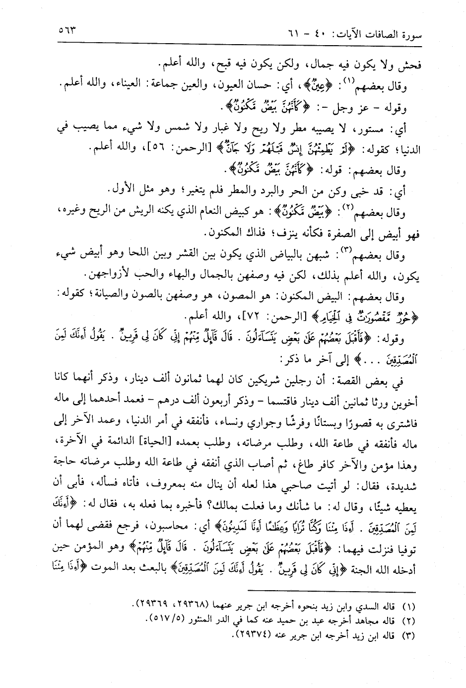 وقوله: (فَأَقْبَلَ بَعْضُهُمْ عَلَى بَعْضٍ يَتَسَاءَلُونَ (50) قَالَ قَائِلٌ مِنْهُمْ إِنِّي كَانَ لِي قَرِينٌ (51) يَقُولُ أَإِنَّكَ لَمِنَ الْمُصَدِّقِينَ (52). . .) إلى آخر ما ذكر: في بعض القصة: أن رجلين شريكين كان لهما ثمانون ألف دينار، وذكر أنهما كانا أخوين ورثا ثمانين ألف دينار فاقتسما - وذكر أربعون ألف درهم - فعمد أحدهما إلى ماله فاشترى به قصورًا وبستانًا وفرشًا وجواري ونساء، فأنفقه في أمر الدنيا، وعمد الآخر إلى ماله فأنفقه في طاعة اللَّه، وطلب مرضاته، وطلب [بعمده] الحياة الدائمة في الآخرة، وهذا مؤمن والآخر كافر طاغ، ثم أصاب الذي أنفقه في طاعة اللَّه وطلب مرضاته حاجة شديدة، فقال: لو أتيت صاحبي هذا لعله أن ينال منه بمعروف، فأتاه فسأله، فأبى أن يعطيه شيئًا، وقال له: ما شأنك وما فعلت بمالك؟ فأخبره بما فعله به، فقال له: (أَإِنَّكَ لَمِنَ الْمُصَدِّقِينَ (52) أَإِذَا مِتْنَا وَكُنَّا تُرَابًا وَعِظَامًا أَإِنَّا لَمَدِينُونَ (53) أي: محاسبون، فرجع فقضى لهما أن توفيا فنزلت فيهما: (فَأَقْبَلَ بَعْضُهُمْ عَلَى بَعْضٍ يَتَسَاءَلُونَ (50) قَالَ قَائِلٌ مِنْهُمْ) وهو المؤمن حين أدخله اللَّه الجنة (إِنِّي كَانَ لِي قَرِينٌ. يَقُولُ أَإِنَّكَ لَمِنَ الْمُصَدِّقِينَ) بالبعث بعد الموت (أَإِذَا مِتْنَا