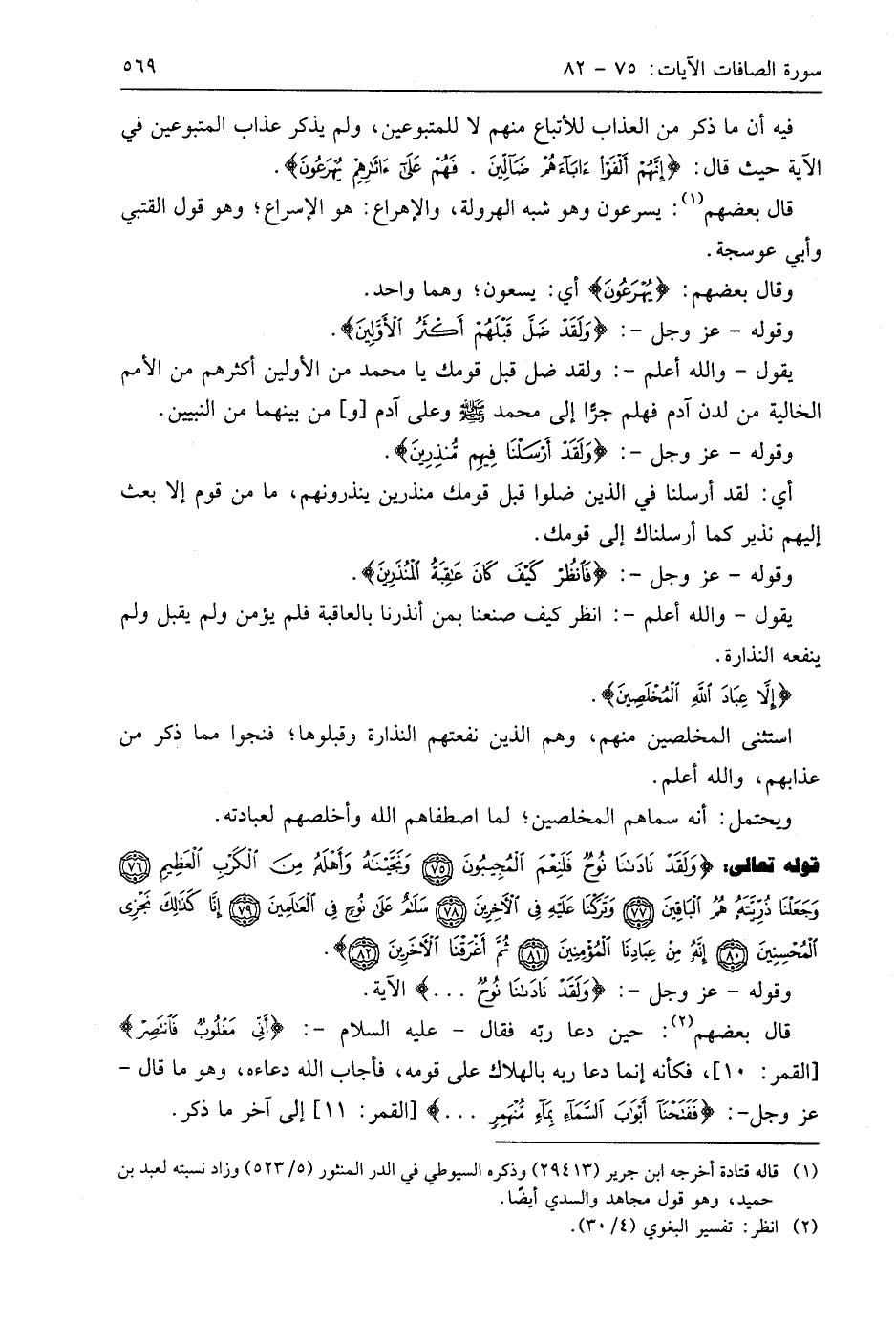 قوله تعالى: (وَلَقَدْ نَادَانَا نُوحٌ فَلَنِعْمَ الْمُجِيبُونَ (75) وَنَجَّيْنَاهُ وَأَهْلَهُ مِنَ الْكَرْبِ الْعَظِيمِ (76) وَجَعَلْنَا ذُرِّيَّتَهُ هُمُ الْبَاقِينَ (77) وَتَرَكْنَا عَلَيْهِ فِي الْآخِرِينَ (78) سَلَامٌ عَلَى نُوحٍ فِي الْعَالَمِينَ (79) إِنَّا كَذَلِكَ نَجْزِي الْمُحْسِنِينَ (80) إِنَّهُ مِنْ عِبَادِنَا الْمُؤْمِنِينَ (81) ثُمَّ أَغْرَقْنَا الْآخَرِينَ (82)