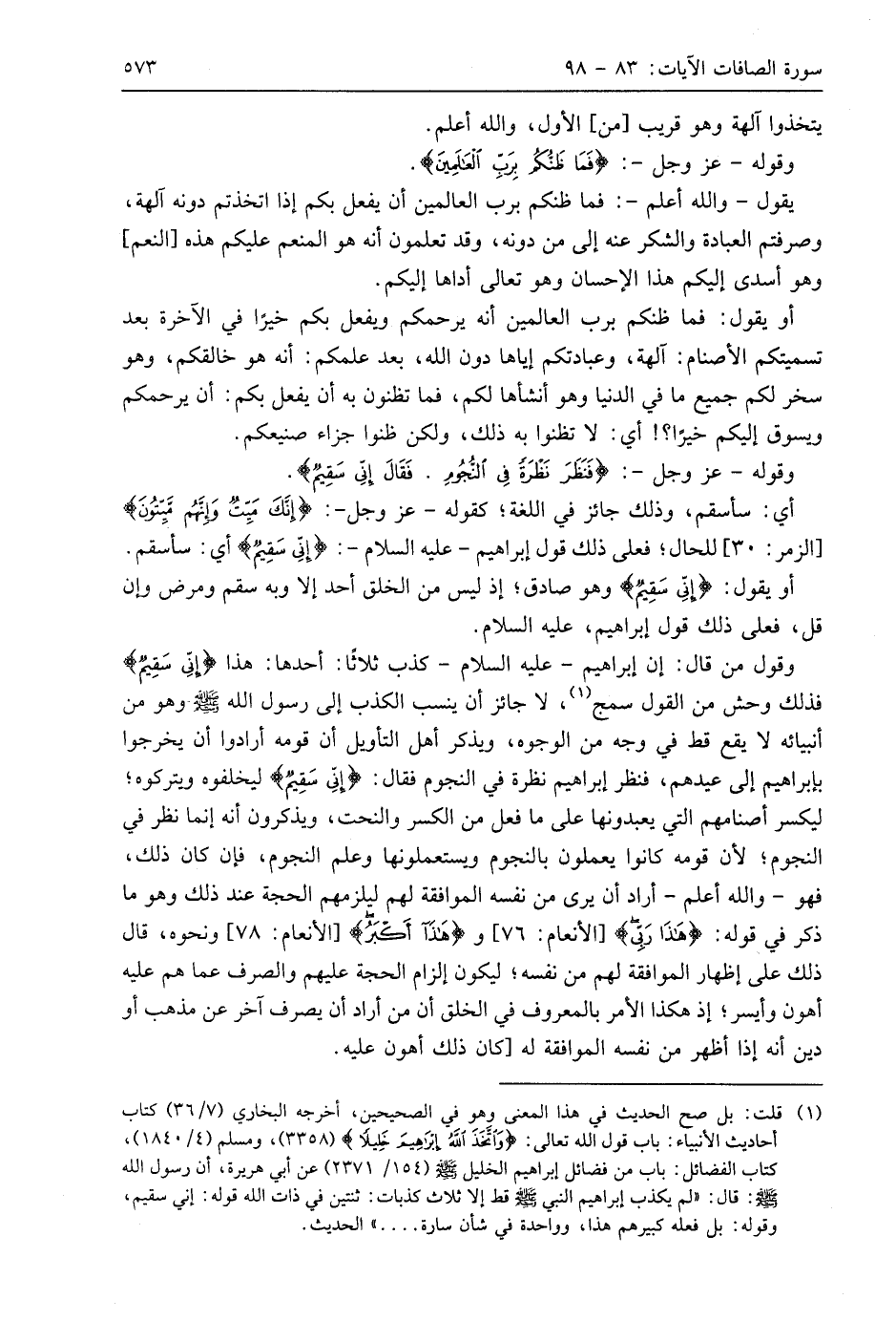 وقول من قال: إن إبراهيم - عليه السلام - كذب ثلاثًا: أحدها: هذا (إِنِّي سَقِيمٌ) فذلك [وخش من القول سمج]، لا جائز أن ينسب الكذب إلى رسول اللَّه - صَلَّى اللَّهُ عَلَيهِ وَسَلَّمَ - وهو من أنبيائه لا يقع قط في وجه من الوجوه، ويذكر أهل التأويل أن قومه أرادوا أن يخرجوا بإبراهيم إلى عيدهم، فنظر إبراهيم نظرة في النجوم فقال: (إِنِّي سَقِيمٌ) ليخلفوه ويتركوه؛ ليكسر أصنامهم التي يعبدونها على ما فعل من الكسر والنحت، ويذكرون أنه إنما نظر في النجوم؛ لأن قومه كانوا يعملون بالنجوم ويستعملونها وعلم النجوم، فإن كان ذلك، فهو - واللَّه أعلم - أراد أن يرى من نفسه الموافقة لهم ليلزمهم الحجة عند ذلك وهو ما ذكر في قوله: (هَذَا رَبِّي)، و (هَذَا أَكْبَرُ)، ونحوه، قال ذلك على إظهار الموافقة لهم من نفسه؛ ليكون إلزام الحجة عليهم والصرف عما هم عليه أهون وأيسر؛ إذ هكذا الأمر بالمعروف في الخلق أن من أراد أن يصرف آخر عن مذهب أو دين أنه إذا أظهر من نفسه الموافقة له كان ذلك أهون عليه.