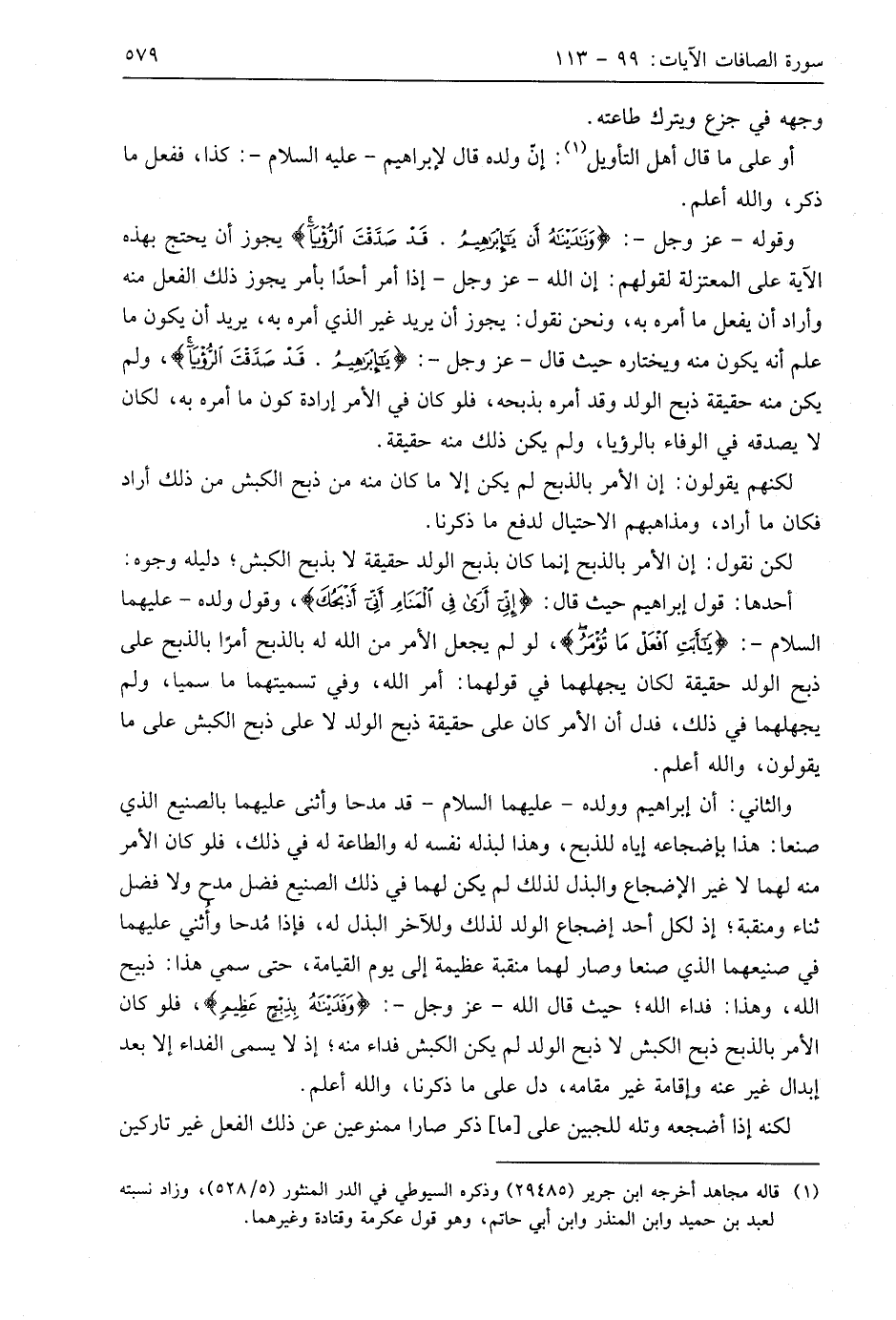 لكن نقول: إن الأمر بالذبح إنما كان بذبح الولد حقيقة لا بذبح الكبش؛ دليله وجوه: أحدها: قول إبراهيم حيث قال: (إِنِّي أَرَى فِي الْمَنَامِ أَنِّي أَذْبَحُكَ)، وقول ولده - عليهما السلام -: (يَا أَبَتِ افْعَلْ مَا تُؤْمَرُ)، لو لم يجعل الأمر من اللَّه له بالذبح أمرًا بالذبح على ذبح الولد حقيقة لكان يجهلهما في قولهما: أمر اللَّه، وفي تسميتهما ما سميا، ولم يجهلهما في ذلك، فدل أن الأمر كان على حقيقة ذبح الولد لا على ذبح الكبش على ما يقولون، واللَّه أعلم.