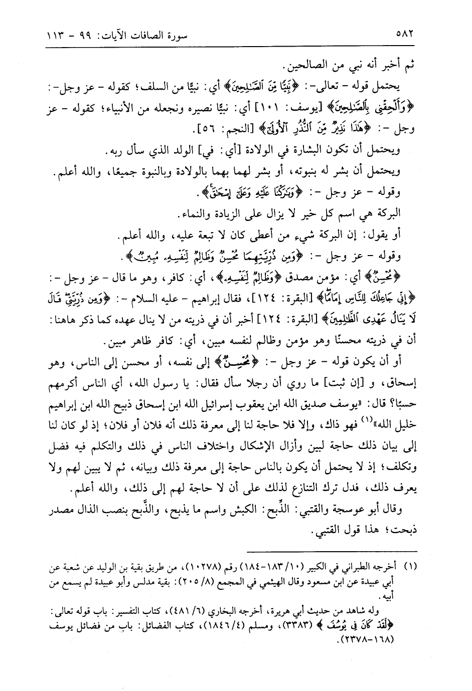 أو أن يكون قوله - عَزَّ وَجَلَّ -: (مُحْسِنٌ) إلى نفسه، أو محسن إلى الناس، وهو إسحاق، وإن ثبت ما روي أن رجلا سأل فقال: يا رسول اللَّه، أي الناس أكرمهم حسبًا؟ قال: " يوسف صديق اللَّه ابن يعقوب إسرائيل اللَّه ابن إسحاق ذبيح اللَّه ابن إبراهيم خليل اللَّه " فهو ذاك، وإلا فلا حاجة لنا إلى معرفة ذلك أنه فلان أو فلان؛ إذ لو كان لنا إلى بيان ذلك حاجة لبين وأزال الإشكال واختلاف الناس في ذلك والتكلم فيه فضل وتكلف؛ إذ لا يحتمل أن يكون بالناس حاجة إلى معرفة ذلك وبيانه، ثم لا يبين لهم ولا يعرف ذلك، فدل ترك التنازع لذلك على أن لا حاجة لهم إلى ذلك، واللَّه أعلم.
