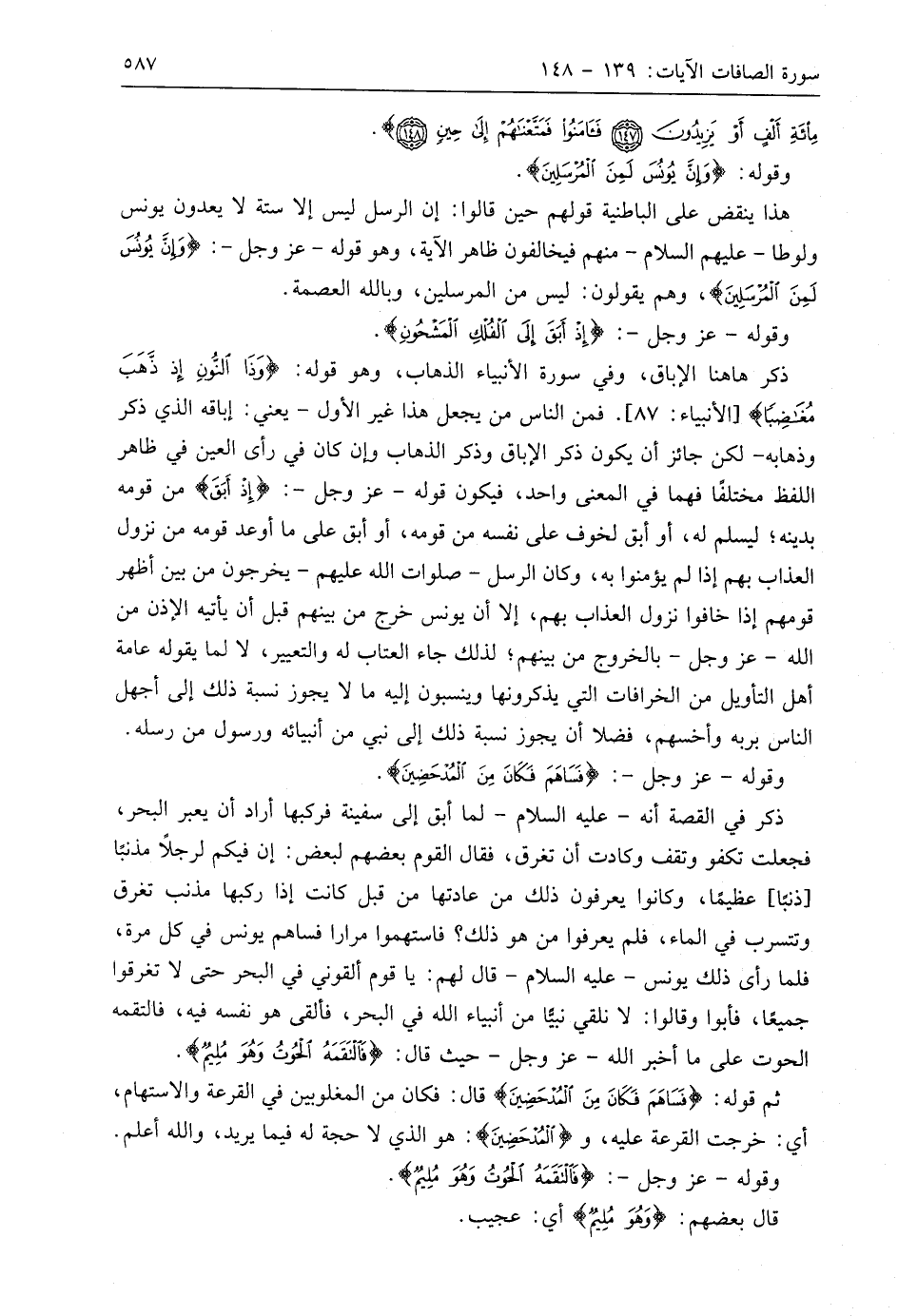 ذكر هاهنا الإباق، وفي سورة الأنبياء الذهاب، وهو قوله: (وَذَا النُّونِ إِذْ ذَهَبَ مُغَاضِبًا). فمن الناس من يجعل هذا غير الأول - يعني: إباقه الذي ذكر وذهابه - لكن جائز أن يكون ذكر الإباق وذكر الذهاب وإن كان في رأى العين في ظاهر اللفظ مختلفًا فهما في المعنى واحد، فيكون قوله - عَزَّ وَجَلَّ -: (إِذْ أَبَقَ) من قومه بدينه؛ ليسلم له، أو أبق لخوف على نفسه من قومه، أو أبق على ما أوعد قومه من نزول العذاب بهم إذا لم يؤمنوا به، وكان الرسل - صلوات اللَّه عليهم - يخرجون من بين أظهر قومهم إذا خافوا نزول العذاب بهم، إلا أن يونس خرج من بينهم قبل أن يأتيه الإذن من اللَّه - عَزَّ وَجَلَّ - بالخروج من بينهم؛ لذلك جاء العتاب له والتعيير، لا لما يقوله عامة أهل التأويل من الخرافات التي يذكرونها وينسبون إليه ما لا يجوز نسبة ذلك إلى أجهل الناس بربه وأخسهم، فضلا أن يجوز نسبة ذلك إلى نبي من أنبيائه ورسول من رسله.