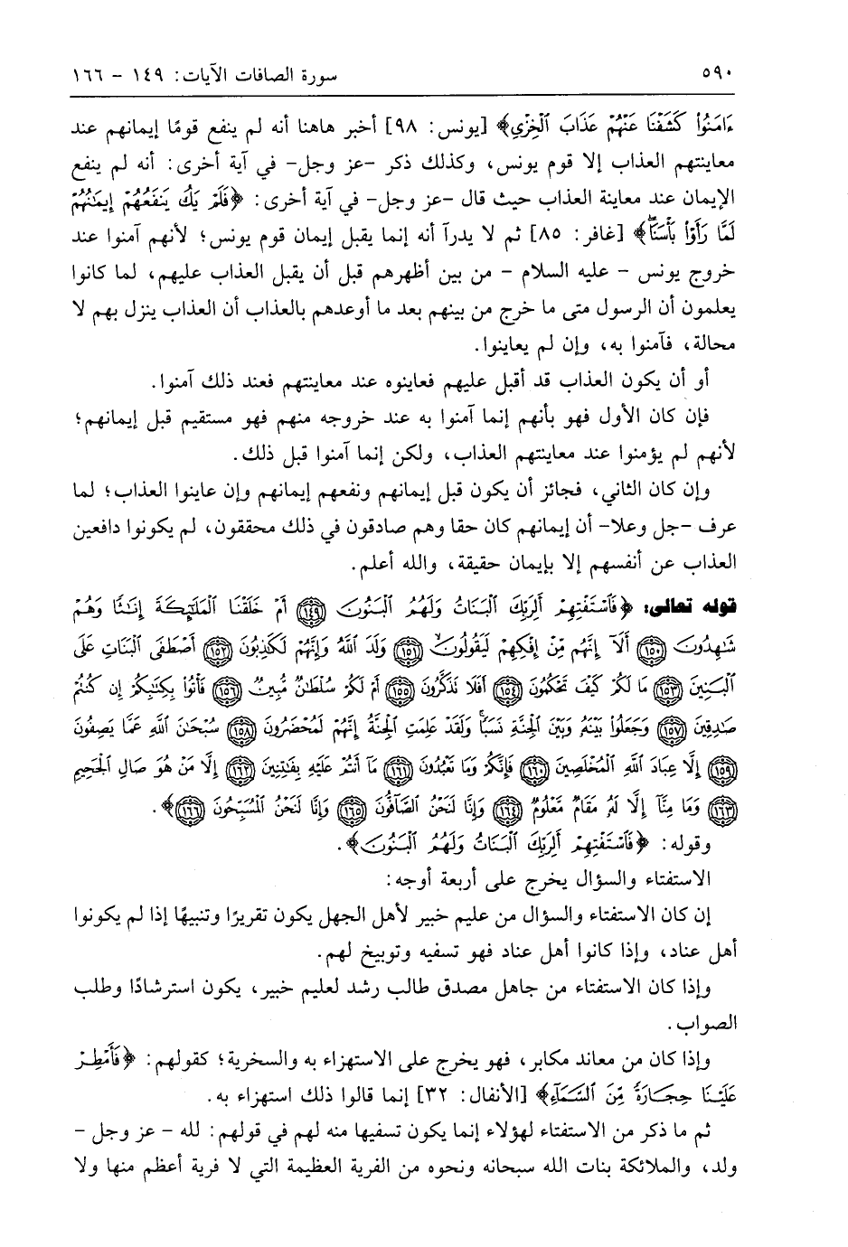 قوله تعالى: (فَاسْتَفْتِهِمْ أَلِرَبِّكَ الْبَنَاتُ وَلَهُمُ الْبَنُونَ (149) أَمْ خَلَقْنَا الْمَلَائِكَةَ إِنَاثًا وَهُمْ شَاهِدُونَ (150) أَلَا إِنَّهُمْ مِنْ إِفْكِهِمْ لَيَقُولُونَ (151) وَلَدَ اللَّهُ وَإِنَّهُمْ لَكَاذِبُونَ (152) أَصْطَفَى الْبَنَاتِ عَلَى الْبَنِينَ (153) مَا لَكُمْ كَيْفَ تَحْكُمُونَ (154) أَفَلَا تَذَكَّرُونَ (155) أَمْ لَكُمْ سُلْطَانٌ مُبِينٌ (156) فَأْتُوا بِكِتَابِكُمْ إِنْ كُنْتُمْ صَادِقِينَ (157) وَجَعَلُوا بَيْنَهُ وَبَيْنَ الْجِنَّةِ نَسَبًا وَلَقَدْ عَلِمَتِ الْجِنَّةُ إِنَّهُمْ لَمُحْضَرُونَ (158) سُبْحَانَ اللَّهِ عَمَّا يَصِفُونَ (159) إِلَّا عِبَادَ اللَّهِ الْمُخْلَصِينَ (160) فَإِنَّكُمْ وَمَا تَعْبُدُونَ (161) مَا أَنْتُمْ عَلَيْهِ بِفَاتِنِينَ (162) إِلَّا مَنْ هُوَ صَالِ الْجَحِيمِ (163) وَمَا مِنَّا إِلَّا لَهُ مَقَامٌ مَعْلُومٌ (164) وَإِنَّا لَنَحْنُ الصَّافُّونَ (165) وَإِنَّا لَنَحْنُ الْمُسَبِّحُونَ (166)