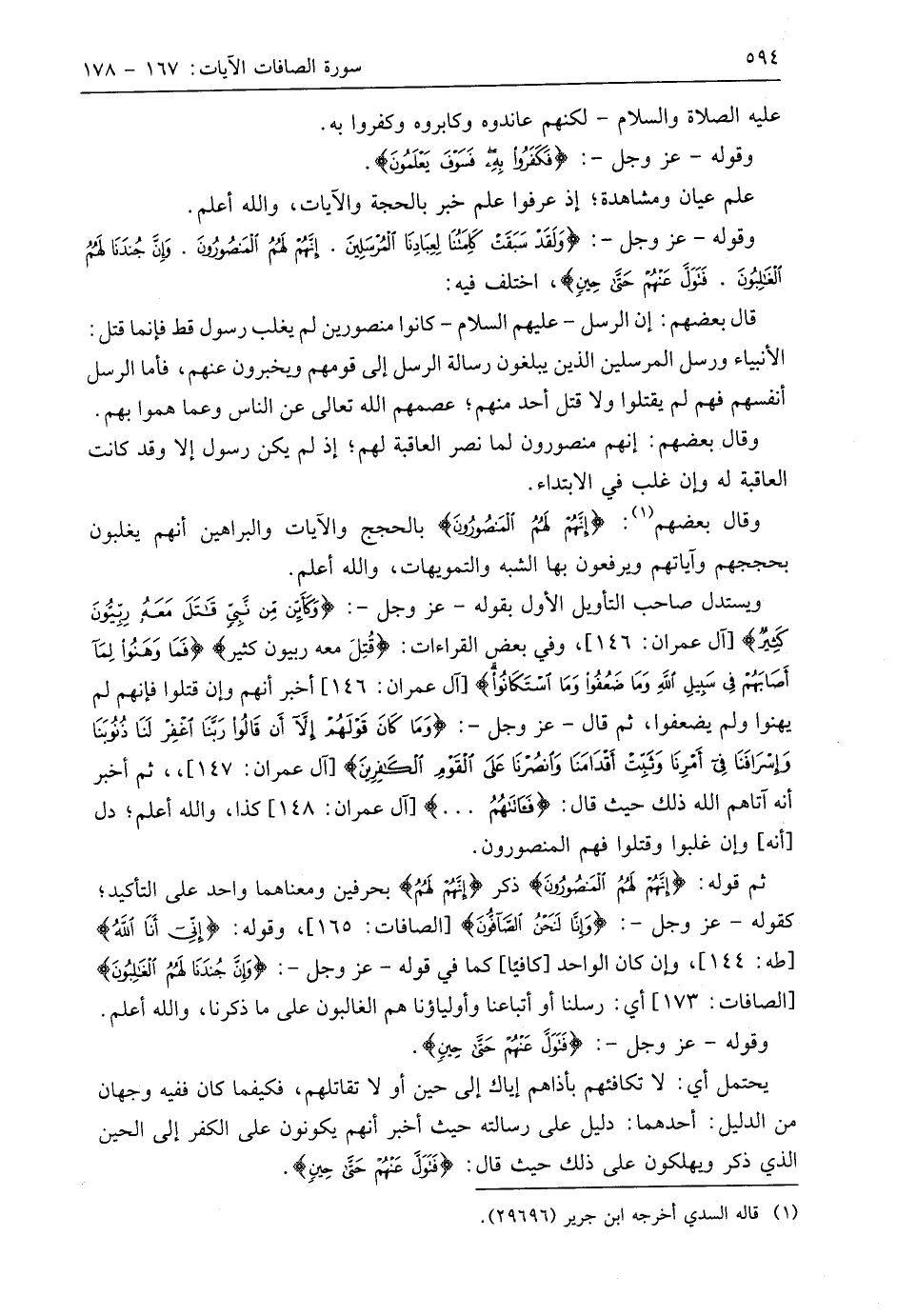 وقوله - عَزَّ وَجَلَّ -: (وَلَقَدْ سَبَقَتْ كَلِمَتُنَا لِعِبَادِنَا الْمُرْسَلِينَ (171) إِنَّهُمْ لَهُمُ الْمَنْصُورُونَ. وَإِنَّ جُنْدَنَا لَهُمُ الْغَالِبُونَ. فَتَوَلَّ عَنْهُمْ حَتَّى حِينٍ)، اختلف فيه: