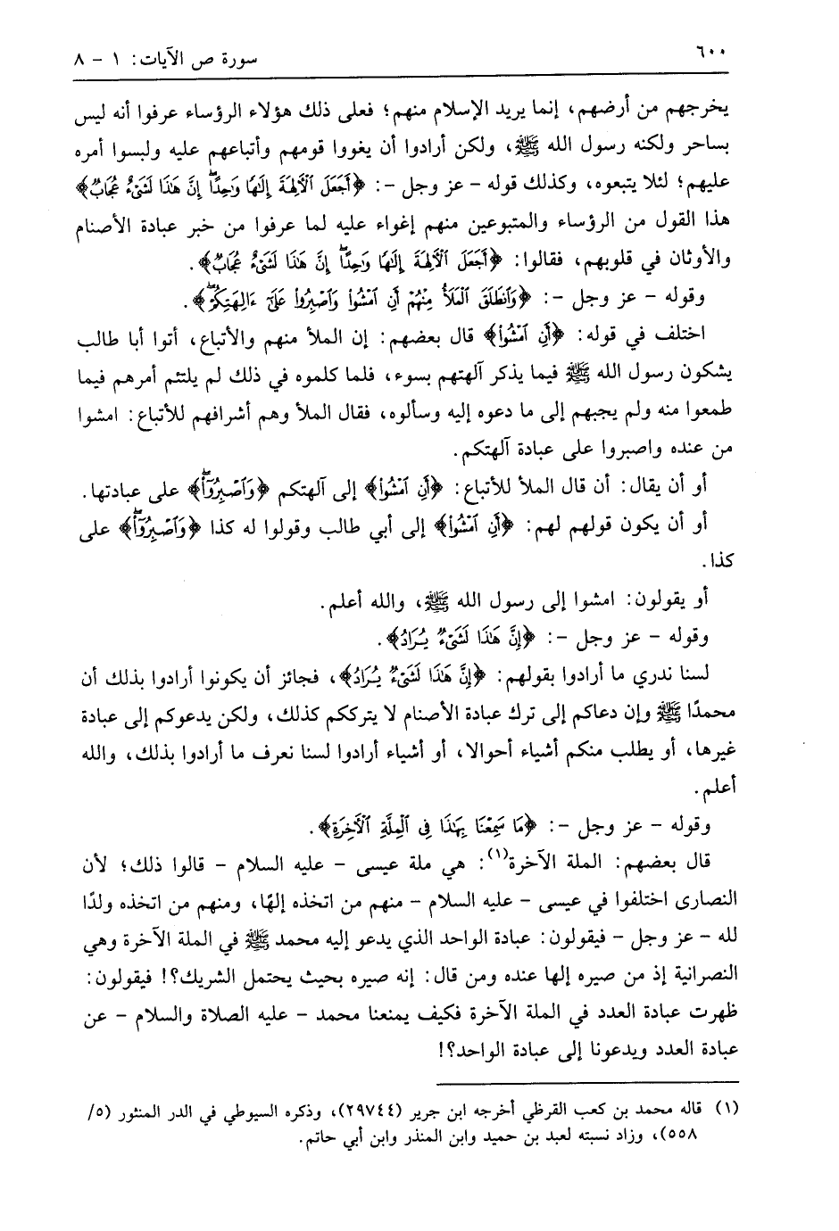 وقوله - عَزَّ وَجَلَّ -: (وَانْطَلَقَ الْمَلَأُ مِنْهُمْ أَنِ امْشُوا وَاصْبِرُوا عَلَى آلِهَتِكُمْ (6) اختلف في قوله: (أَنِ امْشُوا) قَالَ بَعْضُهُمْ: إن الملأ منهم والأتباع، أتوا أبا طالب يشكون رسول اللَّه - صَلَّى اللَّهُ عَلَيهِ وَسَلَّمَ - فيما يذكر آلهتهم بسوء، فلما كلموه في ذلك لم يلتئم أمرهم فيما طمعوا منه ولم يجبهم إلى ما دعوه إليه وسألوه، فقال الملأ وهم أشرافهم للأتباع: امشوا من عنده واصبروا على عبادة آلهتكم.