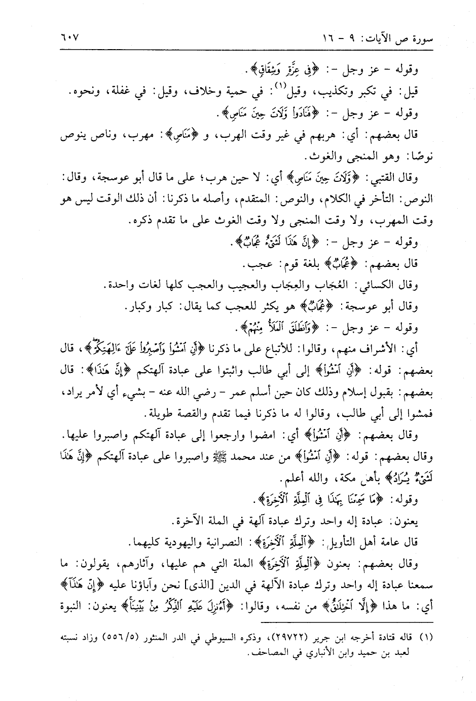 وقَالَ الْقُتَبِيُّ: (وَلَاتَ حِينَ مَنَاصٍ) أي: لا حين هرب؛ على ما قال أَبُو عَوْسَجَةَ، وقال: النوص: التأخر في الكلام، والنوص: المتقدم، وأصله ما ذكرنا: أن ذلك الوقت ليس هو وقت المهرب، ولا وقت المنجى ولا وقت الغوث على ما تقدم ذكره.