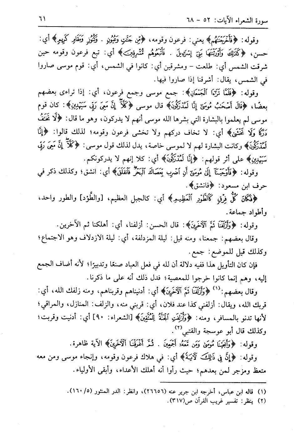 وقوله: (فَأَخْرَجْنَاهُمْ مِنْ جَنَّاتٍ وَعُيُونٍ (57) يعني: فرعون وقومه، (مِنْ جَنَّاتٍ وَعُيُونٍ (57) وَكُنُوزٍ وَمَقَامٍ كَرِيمٍ (58) أي: حسن، (كَذَلِكَ وَأَوْرَثْنَاهَا بَنِي إِسْرَائِيلَ (59) فَأَتْبَعُوهُمْ مُشْرِقِينَ (60) أي: تبع فرعون وقومه حين شرقت الشمس أي: طلعت - ومشرقين أي: كانوا في الشمس، أي: قوم موسى صاروا في الشمس، يقال: أشرقنا إذا صاروا فيها.