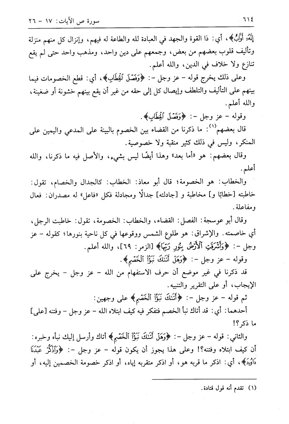 وقال أَبُو عَوْسَجَةَ: الفصل: القضاء، والخطاب: الخصومة، تقول: خاطبت الرجل، أي خاصمته. والإشراق: هو طلوع الشمس ووقوعها في كل ناحية بنورها؛ كقوله - عز وجل -: (وَأَشْرَقَتِ الْأَرْضُ بِنُورِ رَبِّهَا)، واللَّه أعلم.