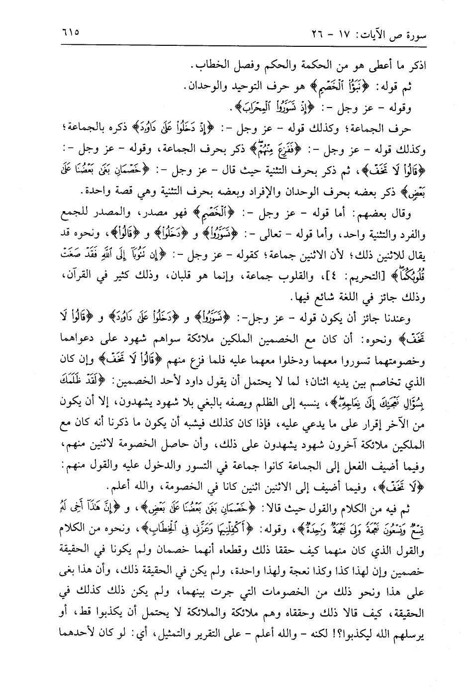حرف الجماعة؛ وكذلك قوله - عَزَّ وَجَلَّ -: (إِذْ دَخَلُوا عَلَى دَاوُودَ ... (22) ذكره بالجماعة؛ وكذلك قوله - عَزَّ وَجَلَّ -: (فَفَزِعَ مِنْهُمْ) ذكر بحرف الجماعة، وقوله - عَزَّ وَجَلَّ -: قوله تعالى: (قَالُوا لَا تَخَفْ)، ثم ذكر بحرف التثنية حيث قال - عَزَّ وَجَلَّ -: (خَصْمَانِ بَغَى بَعْضُنَا عَلَى بَعْضٍ) وذكر بعضه بحرف الوحدان والإفراد وبعضه بحرف التثنية وهي قصة واحدة.