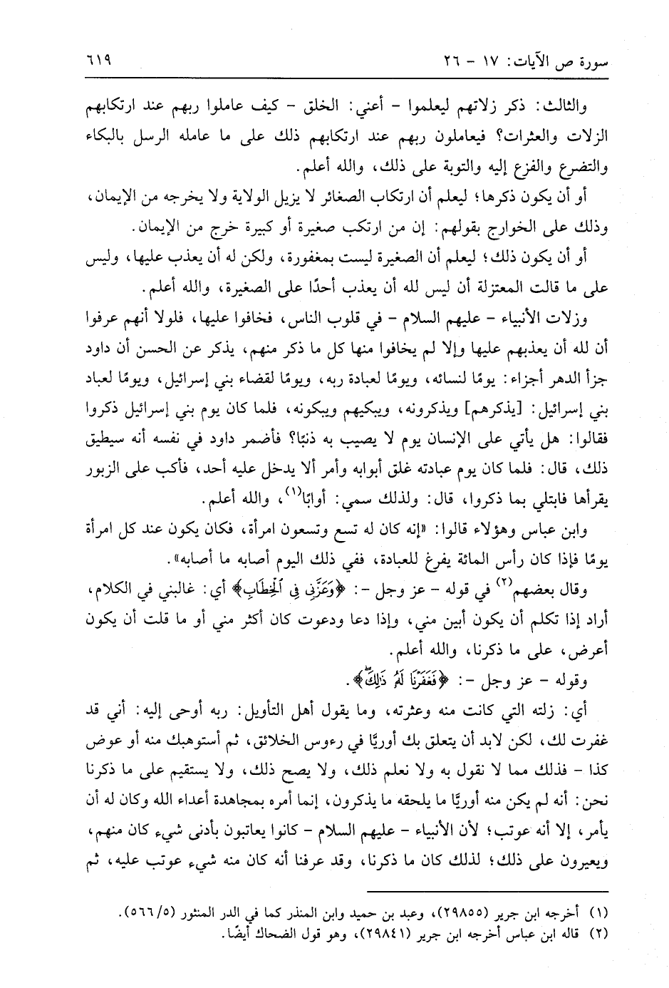وزلات الأنبياء - عليهم السلام - في قلوب الناس، فخافوا عليها، فلولا أنهم عرفوا أن لله أن يعذبهم عليها وإلا لم يخافوا منها كل ما ذكر منهم، يذكر عن الحسن أن داود جزأ الدهر أجزاء: يومًا لنسائه، ويومًا لعبادة ربه، ويومًا لقضاء بني إسرائيل، ويومًا لعباد بني إسرائيل: يذكرهم ويذكرونه، ويبكيهم ويبكونه، فلما كان يوم بني إسرائيل ذكروا فقالوا: هل يأتي على الإنسان يوم لا يصيب به ذنبًا؟ فأضمر داود في نفسه أنه سيطيق ذلك، قال: فلما كان يوم عبادته غلق أبوابه وأمر ألا يدخل عليه أحد، فأكب على الزبور يقرأها فابتلي بما ذكروا، قال: ولذلك سمي: أوَّابًا، واللَّه أعلم.