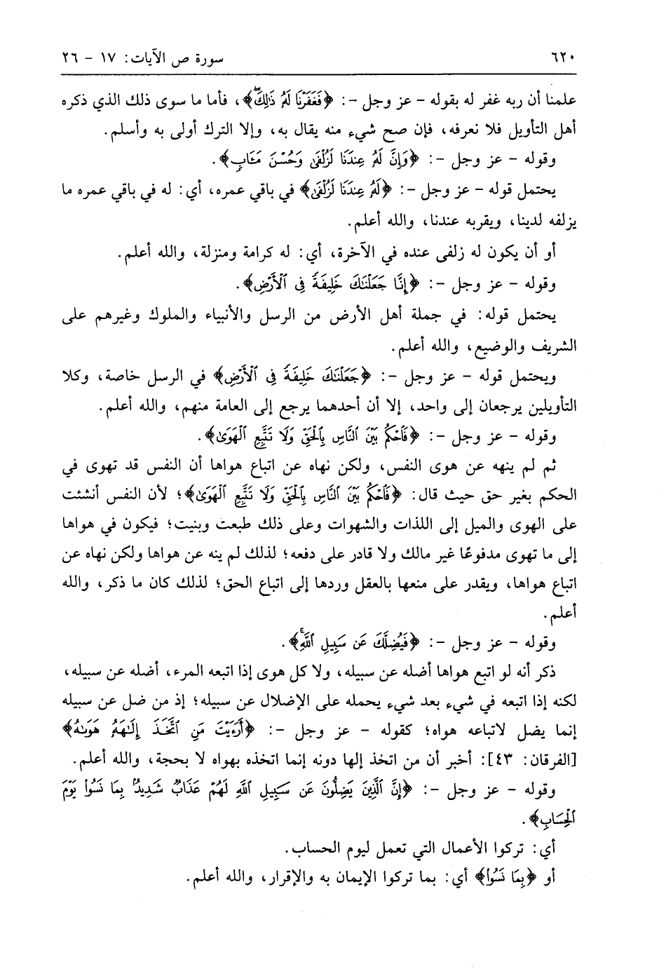 وقوله - عَزَّ وَجَلَّ -: (يَا دَاوُودُ إِنَّا جَعَلْنَاكَ خَلِيفَةً فِي الْأَرْضِ فَاحْكُمْ بَيْنَ النَّاسِ بِالْحَقِّ وَلَا تَتَّبِعِ الْهَوَى فَيُضِلَّكَ عَنْ سَبِيلِ اللَّهِ إِنَّ الَّذِينَ يَضِلُّونَ عَنْ سَبِيلِ اللَّهِ لَهُمْ عَذَابٌ شَدِيدٌ بِمَا نَسُوا يَوْمَ الْحِسَابِ (26)