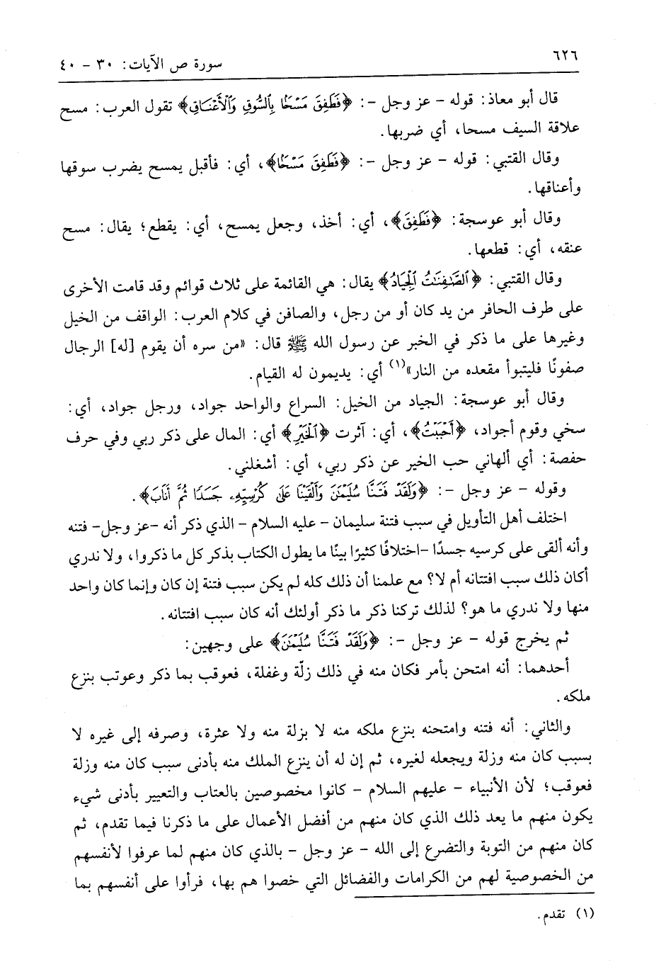 وقَالَ الْقُتَبِيُّ: (الصَّافِنَاتُ الْجِيَادُ) يقال: هي القائمة على ثلاث قوائم وقد قامت الأخرى على طرف الحافر من يد كان أو من رجل، والصافن في كلام العرب: الواقف من الخيل وغيرها على ما ذكر في الخبر عن رسول اللَّه - صَلَّى اللَّهُ عَلَيهِ وَسَلَّمَ - قال: " من سره أن يقوم له الرجال صفونًا فليتبوأ مقعده من النار " أي: يديمون له القيام.