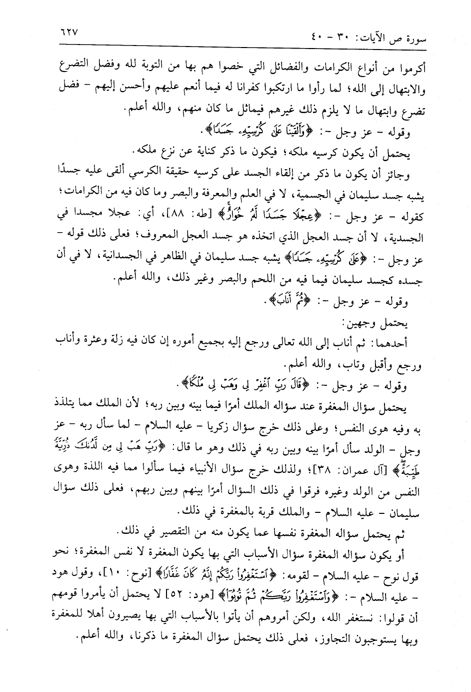 وجائز أن يكون ما ذكر من إلقاء الجسد على كرسيه حقيقة الكرسي ألقى عليه جسدًا يشبه جسد سليمان في الجسمية، لا في العلم والمعرفة والبصر وما كان فيه من الكرامات؛ كقوله - عَزَّ وَجَلَّ -: (عِجْلًا جَسَدًا لَهُ خُوَارٌ)، أي: عجلا مجسدا في الجسدية، لا أن جسد العجل الذي اتخذه هو جسد العجل المعروف؛ فعلى ذلك قوله - عَزَّ وَجَلَّ -: (عَلَى كُرْسِيِّهِ جَسَدًا) أن يشبه جسد سليمان في الظاهر في الجسدانية، لا في أن جسده كجسد سليمان فيما فيه من اللحم والبصر وغير ذلك، واللَّه أعلم.
