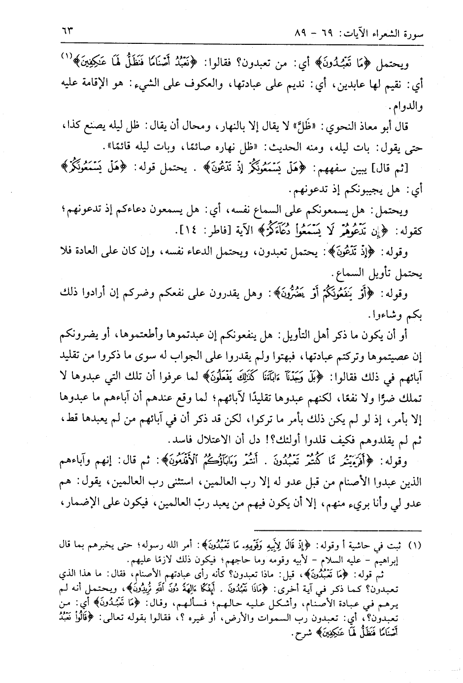 ويحتمل، (مَا تَعْبُدُونَ) أي: من تعبدون؟ فقالوا: (نَعْبُدُ أَصْنَامًا فَنَظَلُّ لَهَا عَاكِفِينَ (71) أي: نقيم عاعابدين، أي: نديم على عبادتها، والعكوف على الشيء: هو الإقامة عليه والدوام.