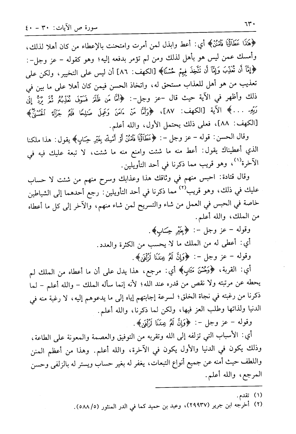 وقال الحسن: قوله - عَزَّ وَجَلَّ -: (عَطَاؤُنَا فَامْنُنْ أَوْ أَمْسِكْ بِغَيْرِ حِسَابٍ) ويقول: هذا ملكنا الذي أعطيناك يقول: أعط منه ما شئت وامنع منه ما شئت، لا تبعة عليك فيه في الآخرة، وهو قريب مما ذكرنا في أحد التأويلين.