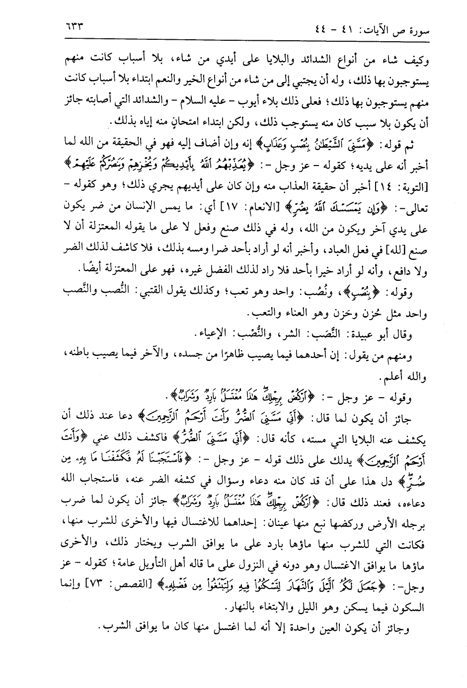ثم قوله: (مَسَّنِيَ الشَّيْطَانُ بِنُصْبٍ وَعَذَابٍ) إنه وإن أضاف إليه فهو في الحقيقة من اللَّه لما أخبر أنه على يديه؛ كقوله - عَزَّ وَجَلَّ -: (يُعَذِّبْهُمُ اللَّهُ بِأَيْدِيكُمْ وَيُخْزِهِمْ وَيَنْصُرْكُمْ عَلَيْهِمْ) أخبر أن حقيقة العذاب منه وإن كان على أيديهم يجري ذلك؛ وهو كقوله - تعالى -: (وَإِنْ يَمْسَسْكَ اللَّهُ بِضُرٍّ)، أي: ما يمس الإنسان من ضر يكون على يدي آخر ويكون من اللَّه، وله في ذلك صنع وفعل لا على ما يقوله المعتزلة أن لا صنع للَّه، في فعل العباد، وأخبر أنه لو أراد بأحد ضرا ومسه بذلك، فلا كاشف لذلك الضر ولا دافع، وأنه لو أراد خيرا بأحد فلا راد لذلك الفضل غيره، فهو على المعتزلة أيضًا.