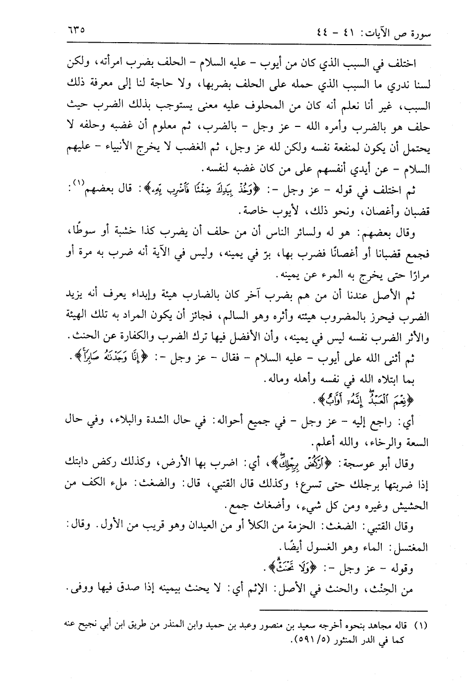 ثم اختلف في قوله - عَزَّ وَجَلَّ -: (وَخُذْ بِيَدِكَ ضِغْثًا فَاضْرِبْ بِهِ): قَالَ بَعْضُهُمْ: قضبان وأغصان، ونحو ذلك، لأيوب خاصة.