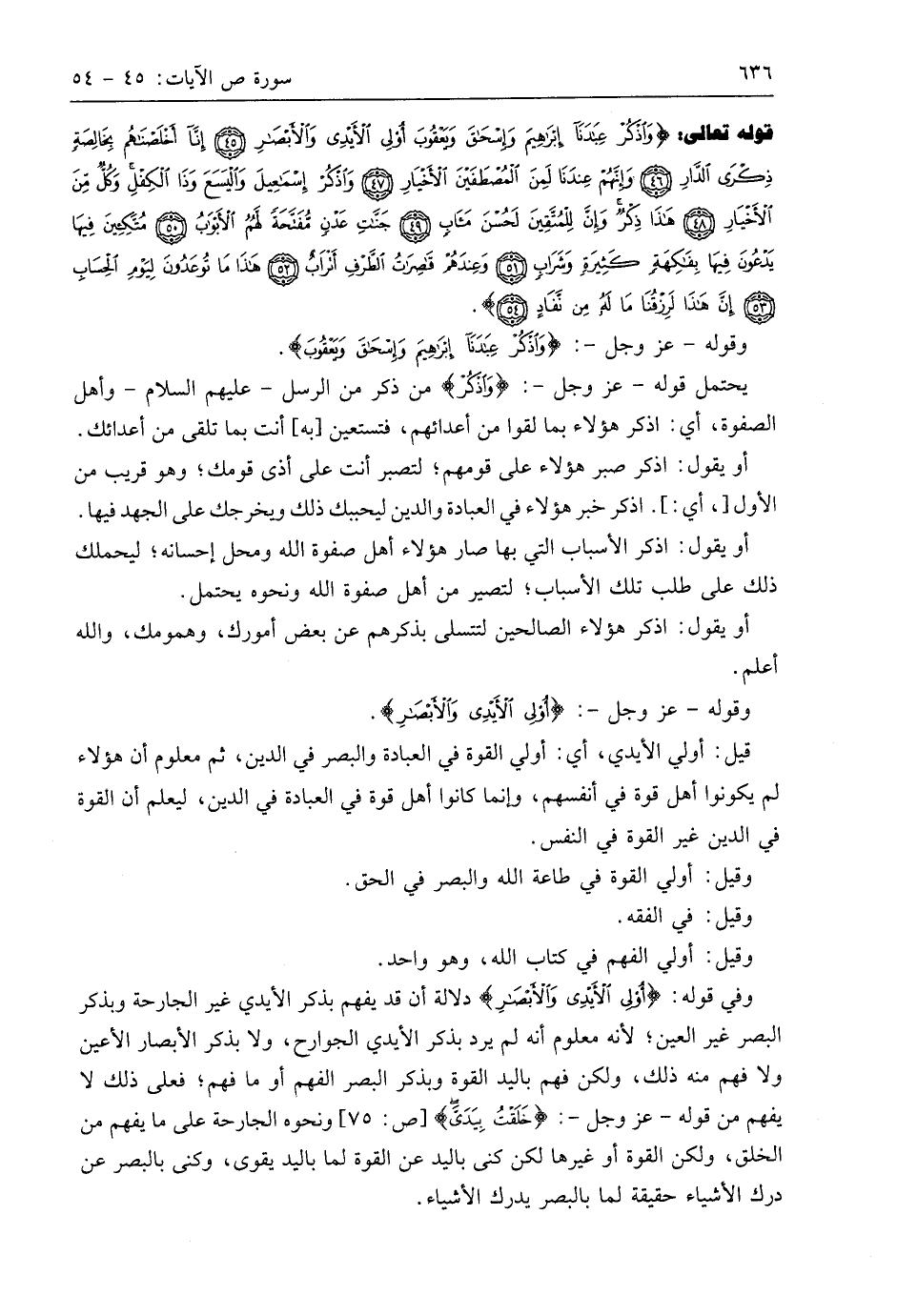 وفي قوله: (أُولِي الْأَيْدِي وَالْأَبْصَارِ) دلالة أن قد يفهم بذكر الأيدي غير الجارحة وبذكر البصر غير العين؛ لأنه معلوم أنه لم يرد بذكر الأيدي الجوارح، ولا بذكر الأبصار الأعين ولا فهم منه ذلك، ولكن فهم باليد القوة وبذكر البصر الفهم أو ما فهم؛ فعلى ذلك لا يفهم من قوله - عَزَّ وَجَلَّ -: (خَلَقْتُ بِيَدَيَّ)، ونحوه الجارحة على ما يفهم من الخلق، ولكن القوة أو غيرها لكن كنى باليد عن القوة لما باليد يقوى، وكنى بالبصر عن درك الأشياء حقيقة لما بالبصر يدرك الأشياء.