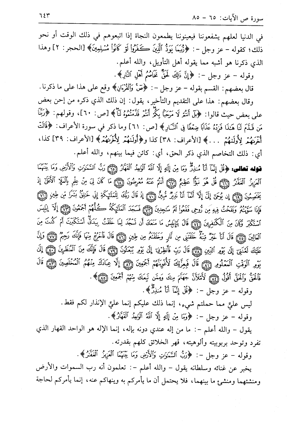 قوله تعالى: (قُلْ إِنَّمَا أَنَا مُنْذِرٌ وَمَا مِنْ إِلَهٍ إِلَّا اللَّهُ الْوَاحِدُ الْقَهَّارُ. رَبُّ السَّمَاوَاتِ وَالْأَرْضِ وَمَا بَيْنَهُمَا الْعَزِيزُ الْغَفَّارُ. قُلْ هُوَ نَبَأٌ عَظِيمٌ (67) أَنْتُمْ عَنْهُ مُعْرِضُونَ (68) مَا كَانَ لِيَ مِنْ عِلْمٍ بِالْمَلَإِ الْأَعْلَى إِذْ يَخْتَصِمُونَ (69) إِنْ يُوحَى إِلَيَّ إِلَّا أَنَّمَا أَنَا نَذِيرٌ مُبِينٌ (70) إِذْ قَالَ رَبُّكَ لِلْمَلَائِكَةِ إِنِّي خَالِقٌ بَشَرًا مِنْ طِينٍ (71) فَإِذَا سَوَّيْتُهُ وَنَفَخْتُ فِيهِ مِنْ رُوحِي فَقَعُوا لَهُ سَاجِدِينَ (72) فَسَجَدَ الْمَلَائِكَةُ كُلُّهُمْ أَجْمَعُونَ (73) إِلَّا إِبْلِيسَ اسْتَكْبَرَ وَكَانَ مِنَ الْكَافِرِينَ (74) قَالَ يَا إِبْلِيسُ مَا مَنَعَكَ أَنْ تَسْجُدَ لِمَا خَلَقْتُ بِيَدَيَّ أَسْتَكْبَرْتَ أَمْ كُنْتَ مِنَ الْعَالِينَ (75) قَالَ أَنَا خَيْرٌ مِنْهُ خَلَقْتَنِي مِنْ نَارٍ وَخَلَقْتَهُ مِنْ طِينٍ (76) قَالَ فَاخْرُجْ مِنْهَا فَإِنَّكَ رَجِيمٌ (77) وَإِنَّ عَلَيْكَ لَعْنَتِي إِلَى يَوْمِ الدِّينِ (78) قَالَ رَبِّ فَأَنْظِرْنِي إِلَى يَوْمِ يُبْعَثُونَ (79) قَالَ فَإِنَّكَ مِنَ الْمُنْظَرِينَ (80) إِلَى يَوْمِ الْوَقْتِ الْمَعْلُومِ (81) قَالَ فَبِعِزَّتِكَ لَأُغْوِيَنَّهُمْ أَجْمَعِينَ (82) إِلَّا عِبَادَكَ مِنْهُمُ الْمُخْلَصِينَ (83) قَالَ فَالْحَقُّ وَالْحَقَّ أَقُولُ (84) لَأَمْلَأَنَّ جَهَنَّمَ مِنْكَ وَمِمَّنْ تَبِعَكَ مِنْهُمْ أَجْمَعِينَ (85)