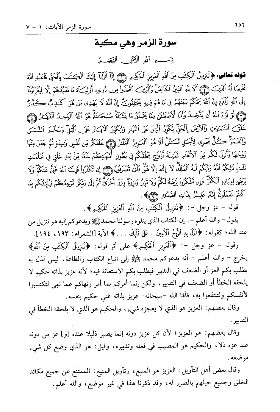 قوله تعالى: (تَنْزِيلُ الْكِتَابِ مِنَ اللَّهِ الْعَزِيزِ الْحَكِيمِ (1) إِنَّا أَنْزَلْنَا إِلَيْكَ الْكِتَابَ بِالْحَقِّ فَاعْبُدِ اللَّهَ مُخْلِصًا لَهُ الدِّينَ (2) أَلَا لِلَّهِ الدِّينُ الْخَالِصُ وَالَّذِينَ اتَّخَذُوا مِنْ دُونِهِ أَوْلِيَاءَ مَا نَعْبُدُهُمْ إِلَّا لِيُقَرِّبُونَا إِلَى اللَّهِ زُلْفَى إِنَّ اللَّهَ يَحْكُمُ بَيْنَهُمْ فِي مَا هُمْ فِيهِ يَخْتَلِفُونَ إِنَّ اللَّهَ لَا يَهْدِي مَنْ هُوَ كَاذِبٌ كَفَّارٌ (3) لَوْ أَرَادَ اللَّهُ أَنْ يَتَّخِذَ وَلَدًا لَاصْطَفَى مِمَّا يَخْلُقُ مَا يَشَاءُ سُبْحَانَهُ هُوَ اللَّهُ الْوَاحِدُ الْقَهَّارُ (4) خَلَقَ السَّمَاوَاتِ وَالْأَرْضَ بِالْحَقِّ يُكَوِّرُ اللَّيْلَ عَلَى النَّهَارِ وَيُكَوِّرُ النَّهَارَ عَلَى اللَّيْلِ وَسَخَّرَ الشَّمْسَ وَالْقَمَرَ كُلٌّ يَجْرِي لِأَجَلٍ مُسَمًّى أَلَا هُوَ الْعَزِيزُ الْغَفَّارُ (5) خَلَقَكُمْ مِنْ نَفْسٍ وَاحِدَةٍ ثُمَّ جَعَلَ مِنْهَا زَوْجَهَا وَأَنْزَلَ لَكُمْ مِنَ الْأَنْعَامِ ثَمَانِيَةَ أَزْوَاجٍ يَخْلُقُكُمْ فِي بُطُونِ أُمَّهَاتِكُمْ خَلْقًا مِنْ بَعْدِ خَلْقٍ فِي ظُلُمَاتٍ ثَلَاثٍ ذَلِكُمُ اللَّهُ رَبُّكُمْ لَهُ الْمُلْكُ لَا إِلَهَ إِلَّا هُوَ فَأَنَّى تُصْرَفُونَ (6) إِنْ تَكْفُرُوا فَإِنَّ اللَّهَ غَنِيٌّ عَنْكُمْ وَلَا يَرْضَى لِعِبَادِهِ الْكُفْرَ وَإِنْ تَشْكُرُوا يَرْضَهُ لَكُمْ وَلَا تَزِرُ وَازِرَةٌ وِزْرَ أُخْرَى ثُمَّ إِلَى رَبِّكُمْ مَرْجِعُكُمْ فَيُنَبِّئُكُمْ بِمَا كُنْتُمْ تَعْمَلُونَ إِنَّهُ عَلِيمٌ بِذَاتِ الصُّدُورِ (7)